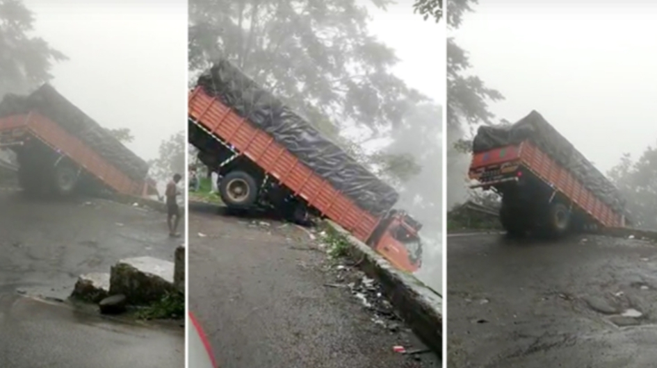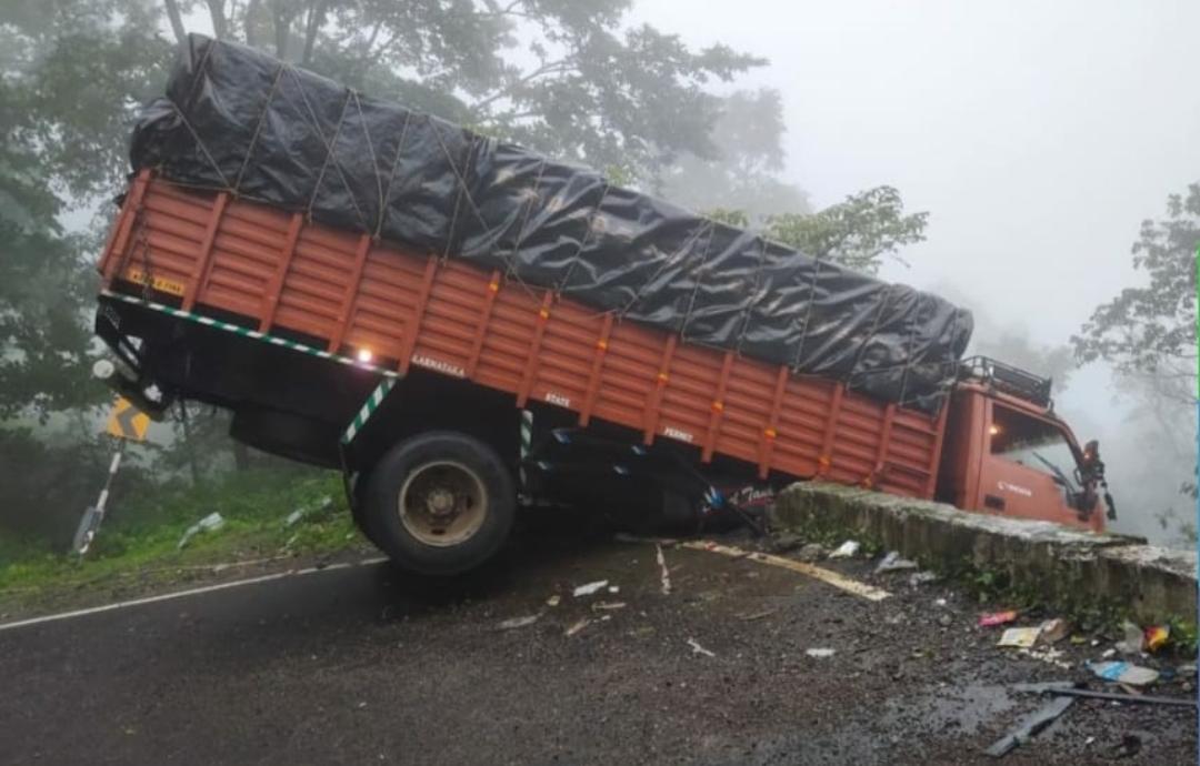 ರಸ್ತೆ ಬದಿ ನಿರ್ಮಿಸಿದ್ದ ಉಕ್ಕಿನ ತಡೆಗೋಡೆ ಇದ್ದ ಕಾರಣ ಟ್ರಕ್ ಅದರ ಮೇಲೇ ನಿಂತಿತ್ತು. ಟ್ರಕ್ನ ಅರ್ಧಭಾಗ ಹೆದ್ದಾರಿ, ಇನ್ನರ್ಧ ಭಾಗ ಪ್ರಪಾತದತ್ತ ನೇತಾಡುತ್ತಿತ್ತು. ಅದೃಷ್ಟವಶಾತ್ ಕೂದಲೆಳೆ ಅಂತರದಲ್ಲಿ ಭಾರಿ ದುರಂತ ತಪ್ಪಿದೆ. ಒಂದು ವೇಳೆ ಟ್ರಕ್ ಪ್ರಪಾತಕ್ಕೆ ಬಿದ್ದಿದ್ದರೆ ಕೆಳಗಿನ ತಿರುವಿನಲ್ಲಿ ಬರುತ್ತಿದ್ದ ವಾಹನಗಳ ಮೇಲೆ ಬೀಳುತ್ತಿತ್ತು!