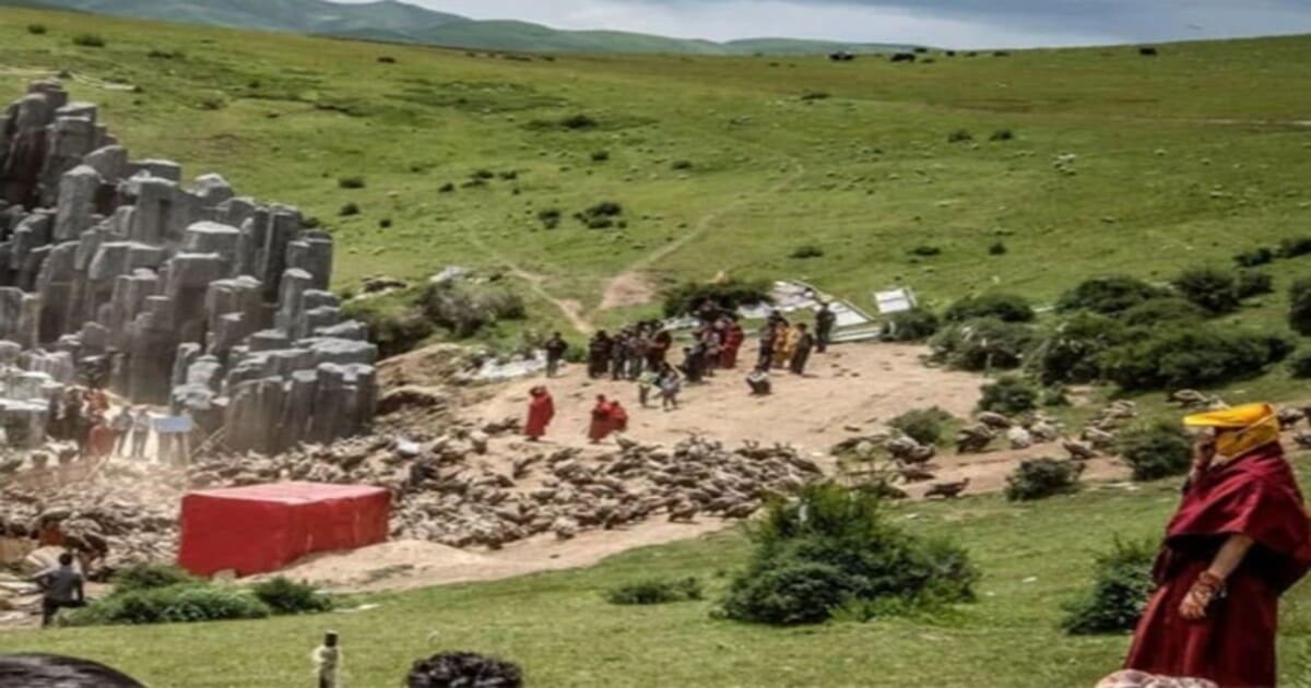 ಟಿಬೆಟ್ ಟ್ರಾವೆಲ್ ಪ್ರಕಾರ ಟಿಬೆಟಿಯನ್ನ ಬೌದ್ಧ ಅನುಯಾಯಿಗಳು ಸತ್ತಾಗ, ದೇಹವನ್ನು ಬಿಳಿ ಬಟ್ಟೆಯಲ್ಲಿ ಸುತ್ತಿಡಲಾಗುತ್ತದೆ. ಅದನ್ನು 3-5 ದಿನಗಳವರೆಗೆ ಮನೆಯ ಒಂದು ಮೂಲೆಯಲ್ಲಿ ಇಡಲಾಗುತ್ತದೆ. ಈ ಸಂದರ್ಭದಲ್ಲಿ ಬೌದ್ಧ ಸನ್ಯಾಸಿಗಳು ಮತ್ತು ಲಾಮಾಗಳು ಆತ್ಮದ ಶುದ್ಧೀಕರಣಕ್ಕಾಗಿ ಧಾರ್ಮಿಕ ಪಠಣಗಳನ್ನು ಪಠಿಸುತ್ತಾರೆ. ಇದರ ನಂತರ ಅವರನ್ನು ಸಮಾಧಿ ಮಾಡುವ ಅದೃಷ್ಟದ ದಿನವನ್ನು ನಿರ್ಧರಿಸುತ್ತಾರೆ. ಶವವನ್ನು ಎತ್ತರದ ಸ್ಥಳಗಳಾದ ಗುಡ್ಡಗಾಡು ಪ್ರದೇಶಗಳಲ್ಲಿ ಇಡಲಾಗುತ್ತದೆ. ಅದು ಅಲ್ಲೇ ಕೊಳೆತು ವಾಸನೆ ಬರಲಾರಂಭಿಸುತ್ತದೆ.