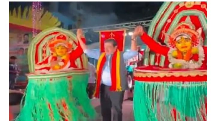 Bangalore: ಚಾಮರಾಜಪೇಟೆಯಲ್ಲಿ ನಡೆದ ಕನ್ನಡ ರಾಜ್ಯೋತ್ಸವ ಕಾರ್ಯಕ್ರಮದಲ್ಲಿ ಪಂಜುರ್ಲಿ ದೈವದ ಪಾತ್ರವನ್ನು ರೂಪಿಸಿ ಸಚಿವ ಜಮೀರ್ ಅಹ್ಮದ್ ಅವರನ್ನು ವೇದಿಕೆಗೆ ಕರೆತರುವ ಒಂದು ಘಟನೆ ನಡೆದಿದೆ. ಇದು ತೀವ್ರ ಟೀಕೆಗೆ ಗುರಿಯಾಗಿದೆ.