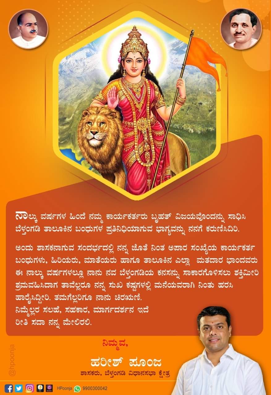 ವಿಧಾನ ಸಭೆಯ ಚುನಾವಣೆಯಲ್ಲಿ ಗೆದ್ದು ಬೆಳ್ತಂಗಡಿಯ ಹೆಮ್ಮೆಯ ಶಾಸಕರಾಗಿ ಆಯ್ಕೆ ಆದ ನಮ್ಮೆಲ್ಲಾ ಪ್ರೀತಿಯ ಹರೀಶ್ ಪೂಂಜಾ, ಶಾಸಕ ಸ್ಥಾನವನ್ನು ಅಲಂಕರಿಸಿ ಇಂದಿಗೆ 4 ವರ್ಷಗಳು ಸಂದುತ್ತದೆ.