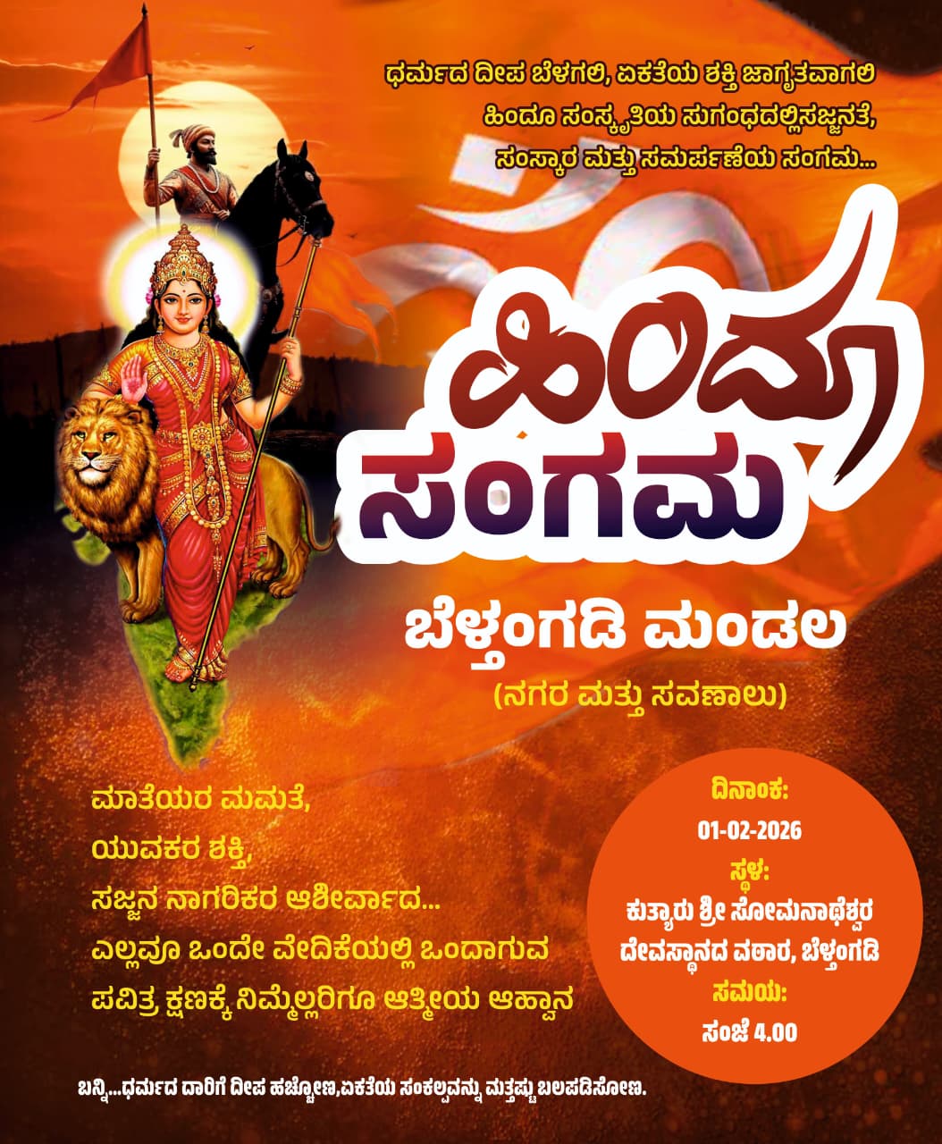 ಧರ್ಮದ ದೀಪ ಬೆಳಗಲಿ, ಏಕತೆಯ ಶಕ್ತಿ ಜಾಗೃತವಾಗಲಿ, ಹಿಂದೂ ಸಂಸ್ಕೃತಿಯ ಸುಗಂಧದಲ್ಲಿ ಸಜ್ಜನತೆ, ಸಂಸ್ಕಾರ ಮತ್ತು ಸಮರ್ಪಣೆಯ ಸಂಗಮ ಹಿಂದೂ ಸಂಗಮ. ಮಾತೆಯರ ಮಮತೆ, ಯುವಕರ ಶಕ್ತಿ, ಸಜ್ಜನ ನಾಗರಿಕರ ಆಶೀರ್ವದ. ಎಲ್ಲವೂ ಒಂದೇ ವೇದಿಕೆಯಲ್ಲಿ ಒಂದಾಗುವ ಪವಿತ್ರ ಕ್ಷಣಕ್ಕೆ ನಿಮ್ಮೆಲ್ಲರಿಗೂ ಆತ್ಮೀಯ ಆಹ್ವಾನ ಕೋರಲಾಗಿದೆ.