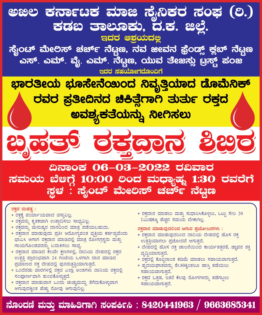 ಕಡಬ : ಅಖಿಲ ಕರ್ನಾಟಕ ಮಾಜಿ ಸೈನಿಕರ ಸಂಘ ಇದರ ಆಶ್ರಯದಲ್ಲಿ ಸೈಂಟ್ ಮೇರಿಸ್ ಚರ್ಚ್ ನೆಟ್ಟಣ,ನವ ಜೀವನ ಫ್ರೆಂಡ್ಸ್ ಕ್ಲಬ್ ನೆಟ್ಟಣ ,ಎಸ್.ಎಮ್.ವೈ.ಎಮ್ ನೆಟ್ಟಣ,ಯುವ ತೇಜಸ್ಸು ಟ್ರಸ್ಟ್ ಪಂಜ ಇದರ ಸಹಯೋಗದೊಂದಿಗೆ ರಕ್ತದಾನ ಶಿಬಿರವು ಮಾರ್ಚ್ 06 ರಂದು ಬೆಳ್ಳಿಗೆ 9ರಿಂದ 1.30ವರೆಗೆ ನೆಟ್ಟಣ ಸೈಂಟ್ ಮೇರಿಸ್ ಚರ್ಚ್ನಲ್ಲಿ ನಡೆಯಲಿದೆ.