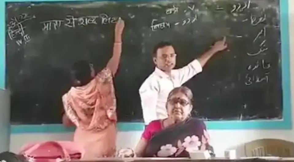 ಶಾಲೆಯೊಂದರಲ್ಲಿ ಇಬ್ಬರು ಶಿಕ್ಷಕರು ಒಂದೇ ತರಗತಿಯ ಕೊಠಡಿಯಲ್ಲಿ ಏಕಕಾಲದಲ್ಲಿ ಮಕ್ಕಳಿಗೆ ಬೋರ್ಡ್ ಮೇಲೆ ಹಿಂದಿ ಹಾಗೂ ಉರ್ದು ಕಲಿಸುತ್ತಿರುವ ವೀಡಿಯೋವೊಂದು ಸೋಶಿಯಲ್ ಮೀಡಿಯಾದಲ್ಲಿ ವೈರಲ್ ಆಗುತ್ತಿದೆ.