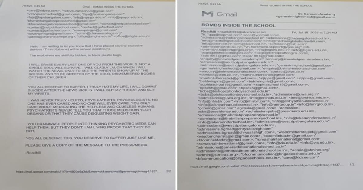 “ಕ್ಲಾಸ್ರೂಮ್ನಲ್ಲಿರುವ ಮಕ್ಕಳ ಬ್ಯಾಗ್ಗಳಲ್ಲಿ ಸ್ಫೋಟಕಗಳನ್ನು ಇಡಲಾಗಿದೆ. ಕಪ್ಪು ಬಣ್ಣದ ಪ್ಲಾಸ್ಟಿಕ್ ಕವರ್ನಲ್ಲಿ ಬಾಂಬ್ ಇರಿಸಲಾಗಿದೆ. ನಾನು ಪ್ರಪಂಚದ ಪ್ರತಿಯೊಬ್ಬರ ಹತ್ಯೆ ಮಾಡುತ್ತೇನೆ, ಯಾರೂ ಉಳಿಯಲು ಸಾಧ್ಯವಿಲ್ಲ” ಎಂದು ಇ-ಮೇಲ್ ಬಂದಿರುವುದಾಗಿ ವರದಿಯಾಗಿದೆ. ಅಲ್ಲದೆ ನಾನು ಪ್ರಪಂಚದ ಪ್ರತಿಯೊಬ್ಬರನ್ನು ಅಳಿಸಿ ಹಾಕುತ್ತೇನೆ. ಈ ಸುದ್ದಿ ಕಂಡು ನಾನು ಸಂತೋಷ ಪಡುತ್ತೇನೆ ಹಾಗೂ ನಗುತ್ತೇನೆ. ಮಕ್ಕಳು ಅಂಗವಿಕಲರಾಗೋದನ್ನ ಪೋಷಕರು ನೋಡಬೇಕು. ನೀವೆಲ್ಲರೂ ಕಷ್ಟ ಅನುಭವಿಸಲು ಅರ್ಹರು ಆಗಿದ್ದೀರಿ. ಈ ಸುದ್ದಿ ಕೇಳಿದ ನಂತರ ನಾನು ಸಹ ಅತ್ಮಹತ್ಯೆ ಮಾಡಿಕೊಳ್ತಿನಿ ಎಂದು ಅಪರಿಚಿತ ವ್ಯಕ್ತಿ ಶಾಲೆಗಳಿಗೆ ಮೇಲ್ ಮಾಡಿದ್ದಾನೆ.