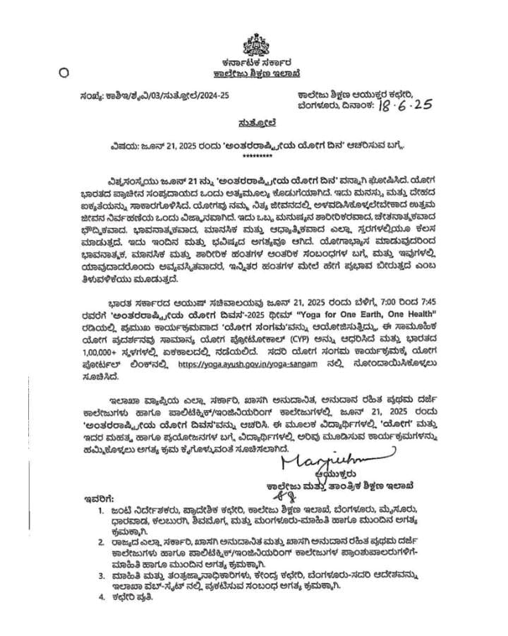 ಶಿಕ್ಷಣ ಇಲಾಖೆ ವ್ಯಾಪ್ತಿಯ ಇಲ್ಲ ಸರ್ಕಾರಿ ಖಾಸಗಿ ಅನುದಾನಿತ ಅನುದಾನ ರಹಿತ ಪ್ರಥಮ ದರ್ಜೆ ಕಾಲೇಜುಗಳು ಹಾಗೂ ಪಾಲಿಟೆಕ್ನಿಕ್, ಇಂಜಿನಿಯರಿಂಗ್ ಕಾಲೇಜುಗಳಲ್ಲಿ ಜೂನ್ 21ರಂದು ಅಂತರಾಷ್ಟ್ರೀಯ ಯೋಗ ದಿನಾಚರಣೆ ಆಚರಿಸುವ ಮೂಲಕ ವಿದ್ಯಾರ್ಥಿಗಳಲ್ಲಿ ಯೋಗದ ಮಹತ್ವದ ಕುರಿತಾಗಿ ಅರಿವು ಮೂಡಿಸಬೇಕೆಂದು ಶಿಕ್ಷಣ ಇಲಾಖೆಯ ಸೂಚಿಸಿದೆ.