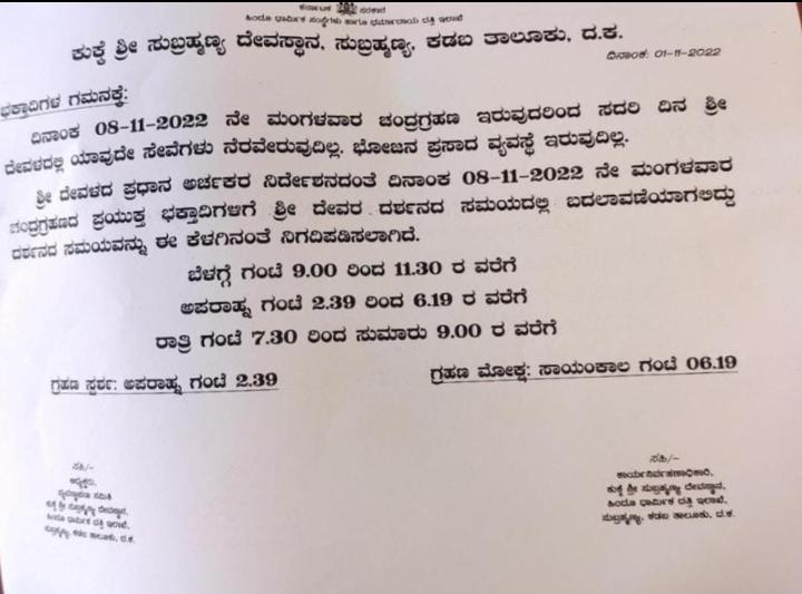 ಸುಬ್ರಹ್ಮಣ್ಯ : ಚಂದ್ರಗ್ರಹಣದ ದಿನವಾದ ನ.8ರಂದು ಕುಕ್ಕೆ ಶ್ರೀ ಸುಬ್ರಹ್ಮಣ್ಯ ದೇವಸ್ಥಾನದಲ್ಲಿ ಸೇವೆಗಳು ನಡೆಯುವುದಿಲ್ಲ ಎಂದು ದೇವಸ್ಥಾನದ ಪ್ರಕಟಣೆ ತಿಳಿಸಿದೆ.