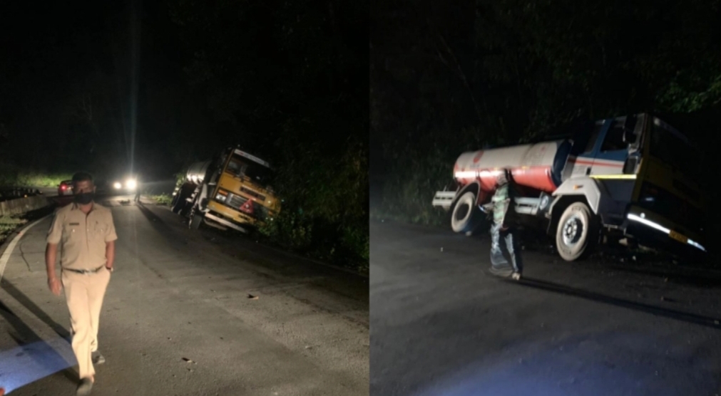 ಪೆಟ್ರೋಲ್ ಟ್ಯಾಂಕರ್ನ ಎರಡು ಚಕ್ರಗಳು ಮಾತ್ರ ರಸ್ತೆ ಬದಿಯ ಹೊಂಡಕ್ಕೆ ಇಳಿದಿದೆ. ಹಾಗಾಗಿ, ಮತ್ತೊಂದು ಬದಿಯ ಎರಡೂ ಚಕ್ರಗಳು ನೆಲದಿಂದ ಮೇಲೆ ಎದ್ದಿವೆ. ಟ್ಯಾಂಕರ್ ನಿಂದ ಪೆಟ್ರೋಲ್ ಸೋರಿಕೆಯಾಗುತ್ತಿದೆ. ಒಂದು ವೇಳೆ ಟ್ಯಾಂಕರ್ ಘಾಟಿಯಲ್ಲಿ ಸಂಪೂರ್ಣ ಪಾತಾಳಕ್ಕೆ ಬಿದ್ದಿದ್ದರೆ ಭಾರೀ ಪ್ರಮಾಣದ ಅನಾಹುತ ಸಂಭವಿಸುತ್ತಿತ್ತು. ಅದೃಷ್ಟವಶಾತ್ ಯಾವುದೇ ದೊಡ್ಡ ಅನಾಹುತ ಸಂಭವಿಸಿಲ್ಲ.