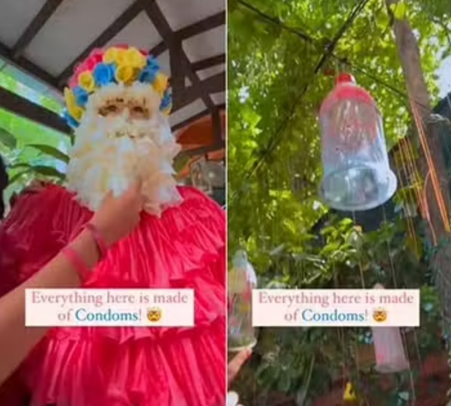 ಬ್ಯಾಂಕಾಂಕ್ ನ ಈ ‘ಕಾಫಿ ಅಂಡ್ ಕಾಂಡೋಮ್ಸ್’ ಕೆಫೆ ಟೋಟಲ್ ಲೀ ಕಾಂಡೊಮ್ ಮಯ. ಅಲ್ಲಿನ ಪ್ರತಿಮೆಗಳು, ಅವಿ ಧರಿಸಿದ ಥರಾವರಿ ಡ್ರೆಸ್ ಗಳು, ಸಂತ ಕ್ಲಾಸ್ ಗಡ್ಡ, ಅಲಂಕರಿಸಿದ ಆಟಿಕೆ, ಹರಡಿ ಇತ್ತಾ ಹೂಗಳು ಹೀಗೆ ಎಲ್ಲವನ್ನೂ ವಿಭಿನ್ನ ಬಣ್ಣದ ಕಾಂಡೋಮ್ ಗಳಿಂದ ರಚಿಸಲಾಗಿದೆ. ಅಷ್ಟೇ ಯಾಕೆ ಟೇಬಲ್ ಸೇರಿದಂತೆ ಕೆಫೆ ಒಳಗಡೆಯ ಬಹುತೇಕ ವಸ್ತುಗಳನ್ನು ಕಾಂಡೋಮ್ ಗಳಿಂದಲೇ ಮಾಡಲಾಗಿದೆ. ಅಲ್ಲದೆ ಗೋಡೆ ಮೇಲಿನ ವಾಲ್ ಪೇಪರ್, ಚಿತ್ರಗಳಲ್ಲಿ ಕೂಡಾ ಕಾಂಡೋಮ್ ಕಂಡುಬರುತ್ತಿದೆ.