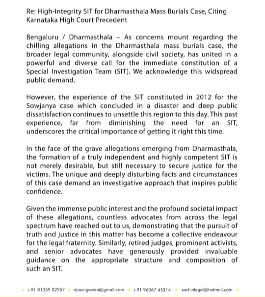 ಧರ್ಮಸ್ಥಳದ ಸಾಮೂಹಿಕ ಅಂತ್ಯಕ್ರಿಯೆ ಪ್ರಕರಣದಲ್ಲಿನ ಚಕಿತಗೊಳಿಸುವ ಆರೋಪಗಳ ಬಗ್ಗೆ ಆರೋಪ ಮತ್ತು ಕಳವಳಗಳು ಹೆಚ್ಚಾಗುತ್ತಿದ್ದಂತೆ, ನಾಗರಿಕ ಸಮಾಜದ ಜೊತೆಗೆ ಕಾನೂನು ಸಂಸ್ಥೆಗಳು ವಿಶೇಷ ತನಿಖಾ ತಂಡ (SIT) ವನ್ನು ತಕ್ಷಣ ರಚಿಸಬೇಕೆಂದು ಪ್ರಬಲ ಮತ್ತು ವೈವಿಧ್ಯಮಯ ಕರೆಯಲ್ಲಿ ಒಗ್ಗೂಡಿದೆ. ಈ ವ್ಯಾಪಕ ಸಾರ್ವಜನಿಕ ಬೇಡಿಕೆಯನ್ನು ನಾವು ಅಂಗೀಕರಿಸುತ್ತೇವೆ ಎಂದು ಅವರು ಹೇಳಿಕೆಯಲ್ಲಿ ತಿಳಿಸಿದ್ದಾರೆ.