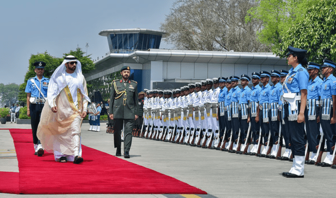 ದುಬೈನ ಕ್ರೌನ್ ಪ್ರಿನ್ಸ್ ಶೇಖ್ ಹಮ್ದನ್ ಬಿನ್ ಮೊಹಮ್ಮದ್ ಬಿನ್ ರಶೀದ್ ಅಲ್ ಮಕ್ತೌಮ್ ಅವರಿಗೆ ದೆಹಲಿ ವಿಮಾನ ನಿಲ್ದಾಣದಲ್ಲಿ ಭಾರತೀಯ ಸಾಂಪ್ರದ್ರಾಯಿಕ ಶೈಲಿಯಲ್ಲಿ ಭರ್ಜರಿ ಸ್ವಾಗತ ಮಾಡಲಾಯಿತು.