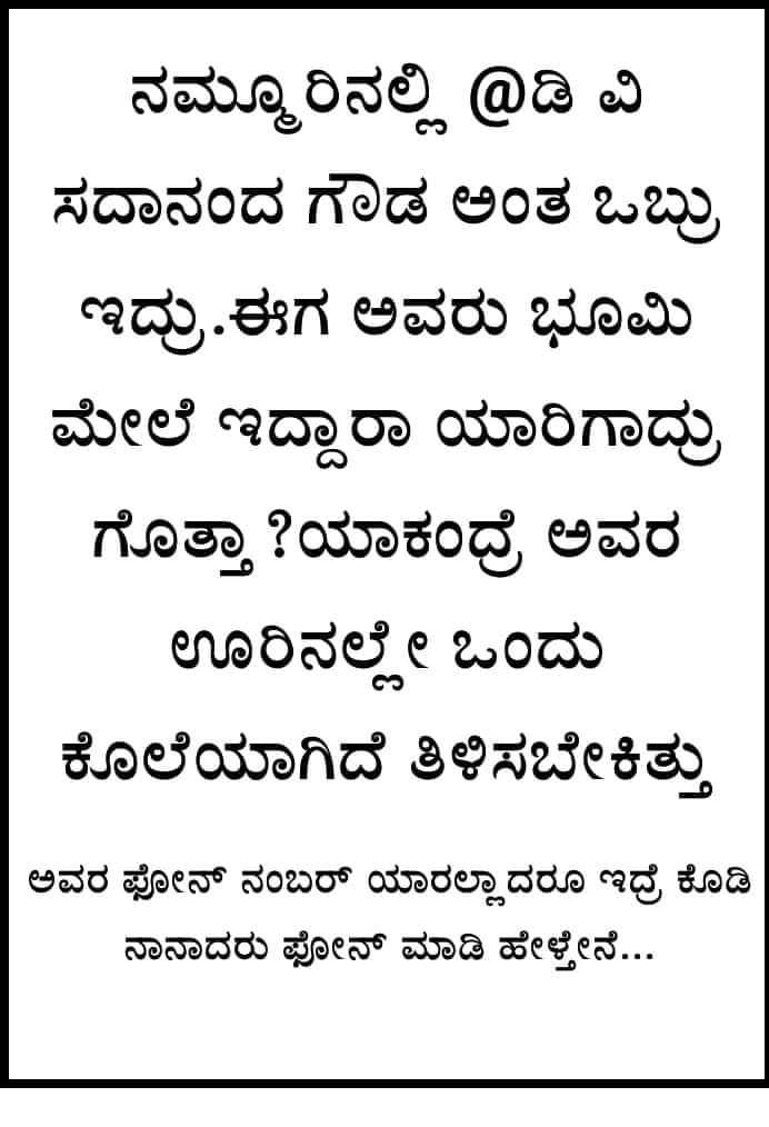 ‘ನಮ್ಮೂರಿನಲ್ಲಿ @ಡಿ.ವಿ ಸದಾನಂದ ಗೌಡ ಅಂತ ಒಬ್ರು ಇದ್ರು. ಈಗ ಅವರು ಭೂಮಿ ಮೇಲೆ ಇದ್ದಾರಾ ಯಾರಿಗಾದ್ರು ಗೊತ್ತಾ? ಯಾಕಂದ್ರೆ ಅವರ ಊರಿನಲ್ಲೇ ಒಂದು ಕೊಲೆಯಾಗಿದೆ ತಿಳಿಸಬೇಕಿತ್ತು ಅವರ ಫೋನ್ ನಂಬರ್ ಯಾರಲ್ಲಾದರೂ ಇದ್ರೆ ಕೊಡಿ, ನಾನಾದರು ಫೋನ್ ಮಾಡಿ ಹೇಳ್ತೇನೆ’ ಎನ್ನುವ ಬರವಣಿಗೆ ಇದೀಗ ಜಾಲತಾಣಗಳಲ್ಲಿ ವೈರಲ್ ಅಗುತ್ತಿದೆ.