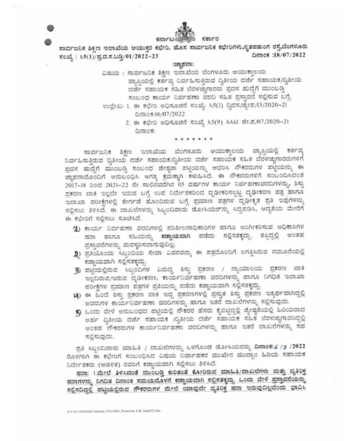 ಈ ನೌಕರರುಗಳಿಗೆ ಸಂಬಂಧಿಸಿದಂತೆ 2017-18 ರಿಂದ 2021-22ನೇ ಸಾಲಿನವರೆಗಿನ 5 ವರ್ಷಗಳ ಕಾರ್ಯ ನಿರ್ವಹಣಾ ವರದಿಗಳನ್ನು, ಶಿಸ್ತು ಪ್ರಕರಣ ಬಾಕಿ ಇಲ್ಲದೇ ಇರುವ ಬಗ್ಗೆ ಉಪ ನಿರ್ದೇಶಕರಿಂದ ದೃಢೀಕರಿಸಲ್ಪಟ್ಟ ದೃಢೀಕರಣ ಪತ್ರ ಹಾಗೂ ಇಲಾಖಾ ಪರೀಕ್ಷೆಗಳಲ್ಲಿ ತೇರ್ಗಡೆ ಹೊಂದಿರುವ ಬಗ್ಗೆ ಪ್ರಮಾಣ ಪತ್ರಗಳ ದೃಢೀಕರಣ ಪತ್ರಿಗಳನ್ನು ಸಲ್ಲಿಸಲು ತಿಳಿಸಿದ್ದಾರೆ.