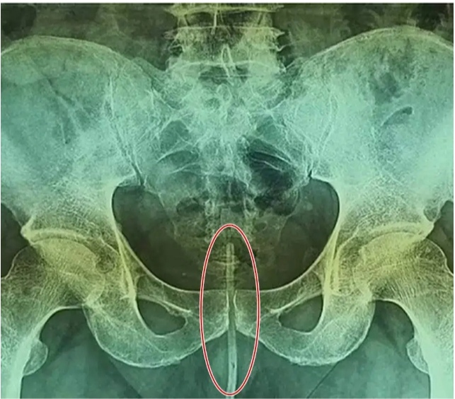 ಈ ವ್ಯಕ್ತಿಯು ಮೂತ್ರವಿಸರ್ಜನೆ ಮಾಡಲು ತಿಣುಕುತ್ತಿದ್ದ. ಈ ಸಂದರ್ಭದಲ್ಲಿ ತನ್ನ ಶಿಶ್ನಕ್ಕೆ ವಿದ್ಯುತ್ ತಂತಿಯನ್ನು ಹಾಕಿ, ಡ್ರೈನೇಜ್ ಪೈಪು ಕಟ್ಟಿಕೊಂಡರೆ ಅದನ್ನು ಡಿ-ಚೋಕ್ ಮಾಡುವಂತೆ ಇಲೆಕ್ಟ್ರಿಕ್ ಕೇಬಲ್ ಅನ್ನು ಒಳಕ್ಕೆ ತಳ್ಳಿದ್ದಾನೆ.