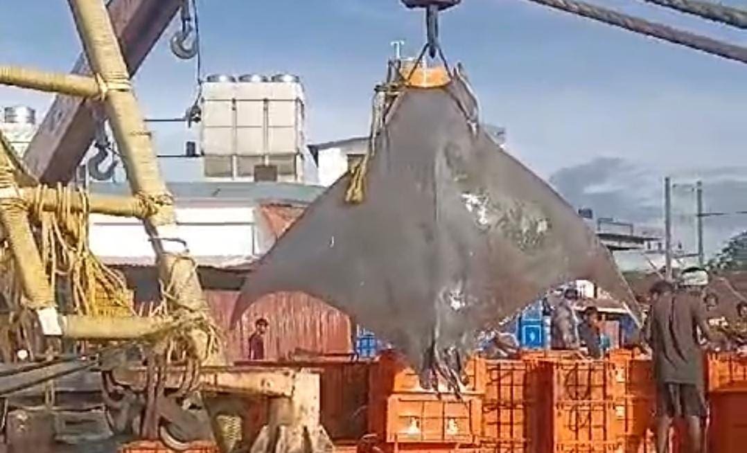 ಸ್ಟಿಂಗ್ ರೇ(Sting ray) ಎಂದು ಕರೆಯಲ್ಪಡುವ ಬೃಹತ್ ತೂಕದ ತೊರಕೆ ಮೀನು ಬಲೆಗೆ ಬಿದ್ದು ಮೀನುಗಾರರ ಅದೃಷ್ಟ ಖುಲಾಯಿಸಿದೆ. ಸುಮಾರು 250 ಕೆಜಿ ತೂಗುವ ತೊರಕೆ ಮೀನು ಬಲೆಗೆ ಬಿದ್ದಿದ್ದು, ಇದು ಅಪರೂಪಕ್ಕೆ ಒಮ್ಮೆ ಸಿಗುವ ಭಾರಿ ಗಾತ್ರದ ತೊರಕೆ ಮೀನಾಗಿದೆ.