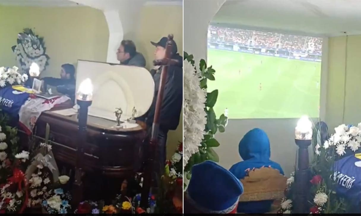 ಶವಪೆಟ್ಟಿಗೆಯನ್ನು ಹೂವುಗಳು ಮತ್ತು ಫುಟ್ಬಾಲ್ ಆಟಗಾರರ ಜೆರ್ಸಿಗಳಿಂದ ಅಲಂಕರಿಸಲಾಗಿದ್ದು, ದೊಡ್ಡ ಪರದೆಯ ಪ್ರೊಜೆಕ್ಟರ್ನಲ್ಲಿ ಚಿಲಿ ಮತ್ತು ಪೆರು ನಡುವಿನ ಫುಟ್ಬಾಲ್ ಪಂದ್ಯವನ್ನು ವೀಕ್ಷಿಸಿದೆ.