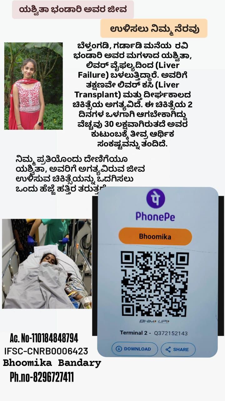ಬೆಳ್ತಂಗಡಿ: ಗರ್ಡಾಡಿ ಮನೆಯ ರವಿ ಭಂಡಾರಿ ಅವರ ಮಗಳಾದ ಯಶ್ಮಿತಾ, ಲಿವರ್ ವೈಫಲ್ಯದಿಂದ (Liver Failure) ಬಳಲುತ್ತಿದ್ದಾರೆ. ಅವರಿಗೆ ತಕ್ಷಣವೇ ಲಿವರ್ ಕ್ಲಸಿ (Liver Transplant) ಮತ್ತು ದೀರ್ಘಕಾಲದ ಚಿಕಿತ್ಸೆಯ ಅಗತ್ಯವಿದೆ. ಈ ಚಿಕಿತ್ಸೆಯ 2 ದಿನಗಳ ಒಳಗಾಗಿ ಆಗಬೇಕಾಗಿದ್ದು, ವೆಚ್ಚವು 30 ಲಕ್ಷದವರೆಗೆ ಹಣದ ಅವಶ್ಯಕತೆ ಇರುತ್ತದೆ ಎಂದು ಮನೆಯವರು ತಿಳಿಸಿದ್ದಾರೆ.