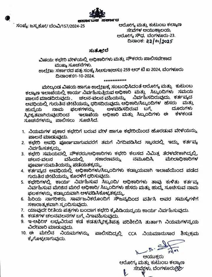 ಈಗಾಗಲೇ ಈ ಸಂಬಂಧ ರಾಜ್ಯ ಆರೋಗ್ಯ ಮತ್ತು ಕುಟುಂಬ ಕಲ್ಯಾಣ ಸೇವೆಗಳ ಆಯುಕ್ತರು ಆದೇಶ ಹೊರಡಿಸಿದ್ದು, ಆರೋಗ್ಯ ಮತ್ತು ಕುಟುಂಬ ಕಲ್ಯಾಣ ಇಲಾಖೆಯಲ್ಲಿ ಕಾರ್ಯ ನಿರ್ವಹಿಸುತ್ತಿರುವ ಅಧಿಕಾರಿ ಮತ್ತು ಸಿಬ್ಬಂದಿಗಳು ನಿಯಮ ಅಳವಡಿಸದಿರುವ ಬಗ್ಗೆ ದೂರುಗಳು ಸ್ವೀಕೃತವಾಗಿರುವುದರಿಂದ ಇಲಾಖೆಯ ಅಧಿಕಾರಿ ಮತ್ತು ಸಿಬ್ಬಂದಿಗಳು ಈ ಕೆಳಗಿನ ಸೂಚನೆಗಳನ್ನು ಪಾಲಿಸಲು ಸೂಚಿಸಿದ್ದಾರೆ.