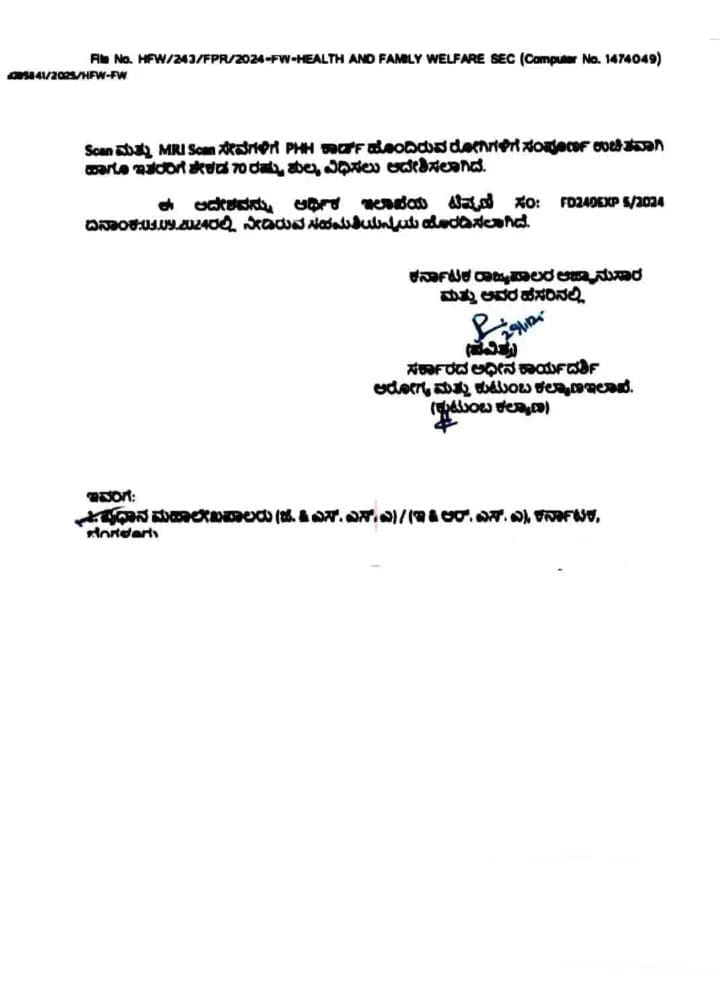 ಮುಂದುವರೆದು ದಿ: 23.02.2024 ರ ತಿದ್ದುಪಡಿ ಆದೇಶದಲ್ಲಿ 7 ವರ್ಷದ ಅವಧಿಗೆ ರೂ. 222.28 ಕೋಟಿಗಳ ವೆಚ್ಚದಲ್ಲಿ ಕ್ರಮ ಕೈಗೊಳ್ಳಲು ಆದೇಶಿಸಲಾಗಿದೆ. Scan ಮತ್ತು MRI Scan ಸೇವೆಗಳಿಗೆ PHH ಕಾರ್ಡ್ ಹೊಂದಿರುವ ರೋಗಿಗಳಿಗೆ ಸಂಪೂರ್ಣ ಉಚಿತವಾಗಿ ಹಾಗೂ ಇತರರಿಗೆ ಶೇಕಡ 70 ರಷ್ಟು ಶುಲ್ಕ ವಿಧಿಸಲು ಆದೇಶಿಸಲಾಗಿದೆ.