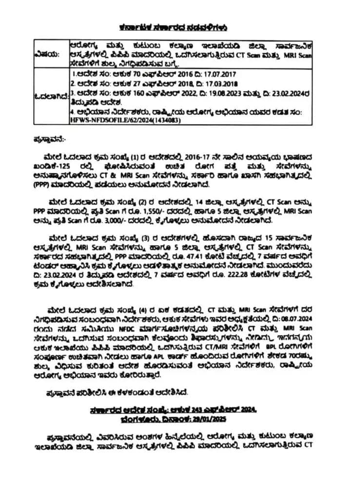 ಉಚಿತ ರೋಗ ಪತ್ತೆ ಮತ್ತು ಸೇವೆಗಳನ್ನು (Health) ಅನುಷ್ಠಾನಗೊಳಿಸಲು CT & MRI Scan ಸೇವೆಗಳನ್ನು ಸರ್ಕಾರಿ ಹಾಗೂ ಖಾಸಗಿ ಸಹಭಾಗಿತ್ವದಲ್ಲಿ (PPP) ಮಾದರಿಯಲ್ಲಿ ಪಡೆಯಲು ಅನುಮೋದನೆ ನೀಡಲಾಗಿದ್ದು, ಮೇಲೆ ಓದಲಾದ ಕ್ರಮ ಸಂಖ್ಯೆ (2) ರ ಆದೇಶದಲ್ಲಿ 14 ಜಿಲ್ಲಾ ಆಸ್ಪತ್ರೆಗಳಲ್ಲಿ CT Scan ಅನ್ನು PPP ಮಾದರಿಯಲ್ಲಿ ಪ್ರತಿ Scan ಗೆ ರೂ. 1,550/- ದರದಲ್ಲಿ ಹಾಗೂ 5 ಜಿಲ್ಲಾ ಆಸ್ಪತ್ರೆಗಳಲ್ಲಿ MRI Scan ಅನ್ನು ಪ್ರತಿ Scan ಗೆ ರೂ. 3,000/- ದರದಲ್ಲಿ ಕೈಗೊಳ್ಳಲು ಅನುಮೋದನೆ ನೀಡಲಾಗಿದೆ.