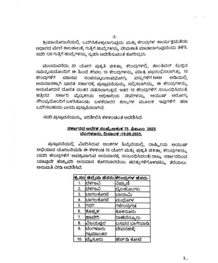 ಪ್ರಸ್ತಾವನೆ ಯಲ್ಲಿ ವಿವರಿಸಿರುವ ಅಂಶಗಳ ಹಿನ್ನೆಲೆಯಲ್ಲಿ, ರಾಷ್ಟ್ರೀಯ ಆಯುಷ್ ಅಭಿಯಾನ ಯೋಜನೆಯಡಿ ಈ ಕೆಳಕಂಡ 10 ಯೋಗ ಮತ್ತು ಪುಕೃತಿ ಚಿಕಿತ್ಸಾ ಕೇಂದ್ರಗಳನ್ನು (ಸದರಿ ಕೇಂದ್ರಗಳಿಗೆ ಅವಶ್ಯವಾಗುವ ಅನುದಾನಕ್ಕೆ ಸಂಬಂಧಿಸಿದಂತೆ) ರಾಜ್ಯ ಸರ್ಕಾರದಿಂದ ಯಾವುದೇ ಹೆಚ್ಚುವರಿ ಅನುದಾನ ಕೋರಬಾರದೆಂಬ ಷರತ್ತುಗಳಿಗೊಳಪಟ್ಟು ತೆರೆಯಲು ಅನುಮತಿ ನೀಡಿ ಆದೇಶಿಸಿದೆ.