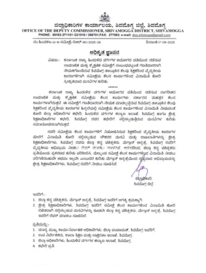 ಕರ್ನಾಟಕ ರಾಜ್ಯ ಹಿಂದುಳಿದ ವರ್ಗಗಳ ಆಯೋಗದ ವತಿಯಿಂದ ನಡೆಸುವ ನಾಗರೀಕರ ಸಾಮಾಜಿಕ ಮತ್ತು ಶೈಕ್ಷಣಿಕ ಸಮೀಕ್ಷೆಗೆ ಗಣತಿದಾರರಾಗಿ ನೇಮಕ ಮಾಡಲ್ಪಟ್ಟಿರುವ ಕೆಲವು ಶಿಕ್ಷಕರಿಂದ(teachers) ವೈದ್ಯಕೀಯ ಕಾರಣಗಳ ಹಿನ್ನಲೆಯಲ್ಲಿ ಸಮೀಕ್ಷೆಯ ಕೆಲಸ ಕಾರ್ಯಗಳಿಂದ ವಿನಾಯಿತಿ ನೀಡುವಂತೆ ಕೋರಿ ಜಿಲ್ಲಾ ಅಧಿಕಾರಿಗಳ ಕಛೇರಿ, ಹಿಂದುಳಿದ ವರ್ಗಗಳ ಕಲ್ಯಾಣ ಇಲಾಖೆ, ಕ್ಷೇತ್ರ ಶಿಕ್ಷಣಾಧಿಕಾರಿಗಳ ಕಛೇರಿಗೆ ಸಲ್ಲಿಸಲ್ಪಡುತ್ತಿರುವ ಮನವಿಗಳ ಕುರಿತು ಸಮಾಲೋಚಿಸಲಾಗಿರುತ್ತದೆ.