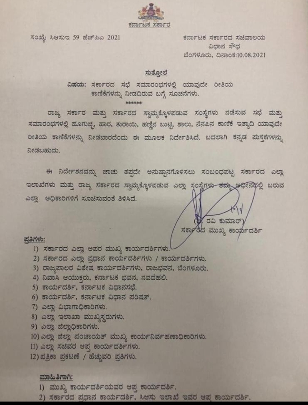 ಈ ಕುರಿತು ಸರ್ಕಾರದ ಮುಖ್ಯ ಕಾರ್ಯದರ್ಶಿ ರವಿಕುಮಾರ್ ಸುತ್ತೋಲೆ ಹೊರಡಿಸಿದ್ದಾರೆ. ಇವೆಲ್ಲ ಕಾಣಿಕೆಗಳ ಬದಲಿಗೆ ಕನ್ನಡ ಪುಸ್ತಕಗಳನ್ನು ಕಾಣಿಕೆಯಾಗಿ ನೀಡಬಹುದು ಎಂದು ಸುತ್ತೋಲೆಯಲ್ಲಿ ತಿಳಿಸಲಾಗಿದೆ.
