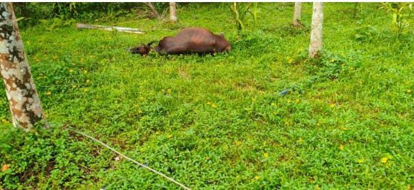 ಹಾಲು ಕರೆಯುವ ಸಂದರ್ಭ ದನದ ಹಗ್ಗವನ್ನು ಬಿಚ್ಚಿದಾಗ ತೋಟದ ಕಡೆ ಓಡಿದ ದನ ಕೃಷಿ ಪಂಪು ಸೆಟ್ಟಿನ ಸಂಪರ್ಕದ ಕಡಿದು ನೆಲದ ಮೇಲೆ ಬಿದ್ದಿದ್ದ ವಿದ್ಯುತ್ ತಂತಿ ಸ್ಪರ್ಶಿಸಿ ಸಾವಿಗೀಡಾಗಿದೆ.
