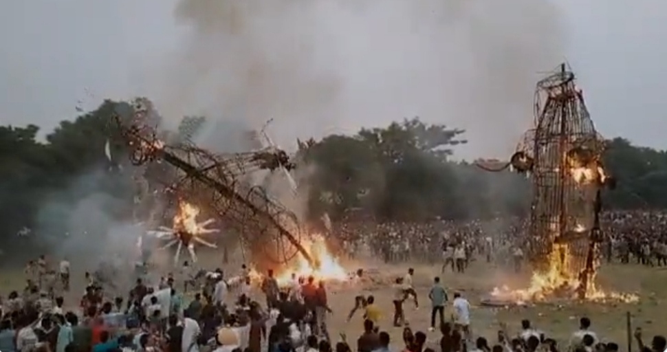 Home » Watch Video: ರಾವಣನ ಪ್ರತಿಕೃತಿ ದಹನ | ಜನರ ಮೇಲೆಯೇ ಬಿದ್ದ ಬೆಂಕಿಯಿಂದ ಹೊತ್ತಿ ಉರಿಯುತ್ತಿದ್ದ ಪ್ರತಿಕೃತಿ