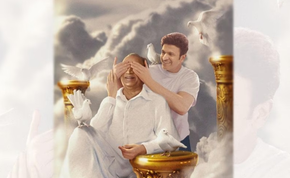 ಯಾವುದೋ ಲೋಕದ ಕಸ್ತೂರಿ ನಿವಾಸದಂತಹ ಒಂದು ಜಾಗ, ಅಲ್ಲೊಂದು ಬಂಗಾರದ ಆಸನ ಮತ್ತು ಅದರ ಮೇಲೆ ಬಿಳಿಯ ಪಂಚೆ–ಶರ್ಟು ಧರಿಸಿ ಕುಳಿತ ಅಣ್ಣಾವ್ರು. ಅವರ ಅಕ್ಕ–ಪಕ್ಕದಲ್ಲಿರುವ ಕಂಬಗಳ ಮೇಲೆ ಪಾರಿವಾಳಗಳು; ಮುಂದೆ ಏನನ್ನೋ ಕಾಣುತ್ತ ಕುಳಿತ ಅಣ್ಣಾವ್ರಿಗೆ ಹಿಂದಿನಿಂದ ಬಂದು ಕಣ್ಣು ಮುಚ್ಚಿರುವ ಅಪ್ಪು. ‘ಅಪ್ಪಾಜಿ ನಾನು ಯಾರು ಹೇಳಿ….’ ಎಂದು ಕೇಳಿ ನಗುತ್ತಿರುವಂತಿದೆ.