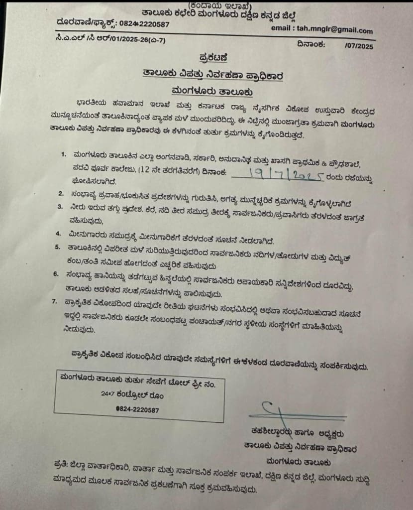 ಉಳ್ಳಾಲ ತಾಲೂಕಿನಾದ್ಯಂತ ವ್ಯಾಪಕ ಮಳೆ ಸುರಿಯುತ್ತಿರುವ ಕಾರಣ ಮುಂಜಾಗೃತ ಕ್ರಮವಾಗಿ ಉಳ್ಳಾಲ ತಾಲೂಕಿನ ಎಲ್ಲಾ ಅಂಗನವಾಡಿ ಕೇಂದ್ರಗಳಿಗೆ, ಪ್ರಾಥಮಿಕ ಮತ್ತು ಪ್ರೌಢ ಶಾಲೆ, ಸರಕಾರಿ ಅನುದಾನಿತ ಮತ್ತು ಖಾಸಗಿ ವಿದ್ಯಾಸಂಸ್ಥೆಗಳಿಗೆ ಜು.19 ಶನಿವಾರ ರಜೆ ಘೋಷಣೆ ಮಾಡಿ ಉಳ್ಳಾಲ ತಹಶೀಲ್ದಾರ್ ಆದೇಶ ಮಾಡಿದ್ದಾರೆ.