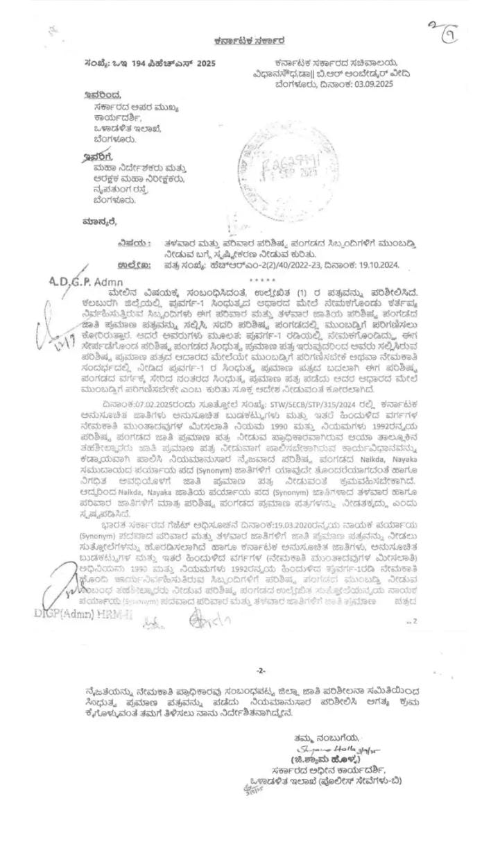 ಉಲ್ಲೇಖಿತ ಸರ್ಕಾರದ ಪತ್ರದಲ್ಲಿ ಕರ್ನಾಟಕ ಅನುಸೂಚಿತ ಜಾತಿಗಳು, ಅನುಸೂಚಿತ ಬುಡಕಟ್ಟುಗಳ ಮತ್ತು ಇತರೆ ಹಿಂದುಳಿದ ವರ್ಗಗಳ (ನೇಮಕಾತಿ ಮುಂತಾದವುಗಳ ಮೀಸಲಾತಿ) ಅಧಿನಿಯಮ 1990 ಮತ್ತು ನಿಯಮಗಳು 1992ರನ್ವಯ ಹಿಂದುಳಿದ ಪ್ರವರ್ಗ-1ರಡಿ ನೇಮಕಾತಿ ಹೊಂದಿ ಕಾರ್ಯನಿರ್ವಹಿಸುತ್ತಿರುವ ಸಿಬ್ಬಂದಿಗಳಿಗೆ ಪರಿಶಿಷ್ಟ ಪಂಗಡದ ಮುಂಬಡ್ತಿ ನೀಡುವ ಸಂಬಂಧ ತಹಶೀಲ್ದಾರರು ನೀಡುವ ಪರಿಶಿಷ್ಟ ಪಂಗಡದ ಉಲ್ಲೇಖಿತ ಸುತ್ತೋಲೆಯನ್ವಯ ನಾಯಕ ಪರ್ಯಾಯ (Synonym) ಪದವಾದ ಪರಿವಾರ ಮತ್ತು ತಳವಾರ ಜಾತಿಗಳಿಗೆ ಜಾತಿ ಪ್ರಮಾಣ ಪತ್ರದ ನೈಜತೆಯನ್ನು ಪಡೆದು ನೇಮಕಾತಿ ಪ್ರಾಧಿಕಾರವು ಸಂಬಂಧಪಟ್ಟ ಜಿಲ್ಲಾ ಜಾತಿ ಪರಿಶೀಲನಾ ಸಮಿತಿಯಿಂದ ಸಿಂಧುತ್ವ ಪ್ರಮಾಣ ಪತ್ರವನ್ನು ಪಡೆದು ನಿಯಮಾನುಸಾರ ಪರಿಶೀಲಿಸಿ ಅಗತ್ಯ ಕ್ರಮ ಕೈಗೊಳ್ಳುವಂತೆ ಈ ಮೂಲಕ ತಿಳಿಸಲಾಗಿದೆ.