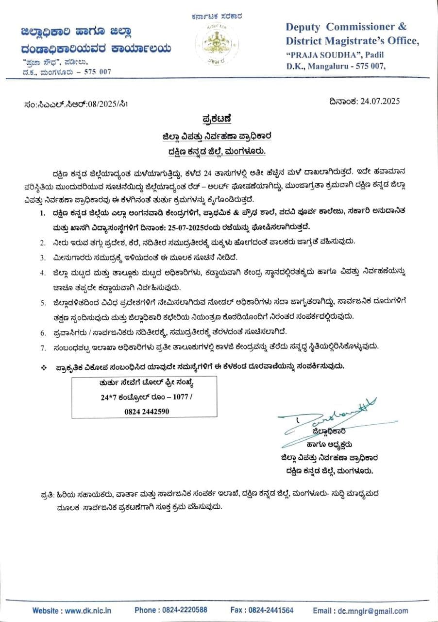 School Holiday: ದಕ್ಷಿಣ ಕನ್ನಡ ಜಿಲ್ಲೆಯಲ್ಲಿ ಭಾರೀ ಮಳೆಯ ಕಾರಣ ರೆಡ್ ಅಲರ್ಟ್ ಘೋಷಣೆಯಾಗಿದ್ದು, ಜಿಲ್ಲೆಯಾದ್ಯಂತ ಎಲ್ಲಾ ಅಂಗನವಾಡಿ, ಸರಕಾರಿ, ಅನುದಾನಿತ ಮತ್ತು ಖಾಸಗಿ ಪ್ರಾಥಮಿಕ ಮತ್ತು ಪ್ರೌಢಶಾಲೆ,ಪದವಿಪೂರ್ವ ಕಾಲೇಜುಗಳಿಗೆ ಜು.25 ರಂದು ರಜೆ ಘೋಷಣೆ ಮಾಡಲಾಗಿದೆ.