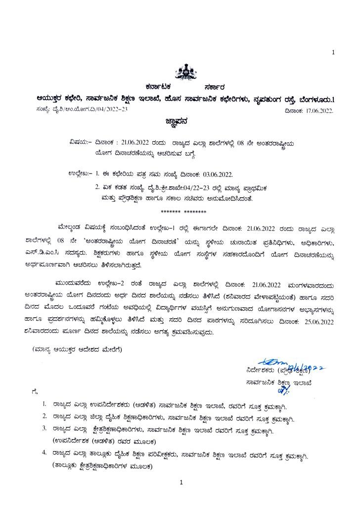 ಅಂತಾರಾಷ್ಟ್ರೀಯ ಯೋಗ ದಿನದ ಪ್ರಯುಕ್ತ ದಿ.21 ರಂದು ರಾಜ್ಯದ ಎಲ್ಲ ಶಾಲೆಗಳಲ್ಲಿ ಯೋಗದಿನವನ್ನು ಆಚರಿಸಬೇಕು ಎಂದು ಶಿಕ್ಷಣ ಇಲಾಖೆ ಆದೇಶ ಹೊರಡಿಸಿದೆ. ಅಂದು ದಿನದ ಮೊದಲ ಒಂದೂವರೆ ಗಂಟೆಯ ಅವಧಿಯಲ್ಲಿ ವಿದ್ಯಾರ್ಥಿಗಳ ವಯಸ್ಸಿಗೆ ಅನುಗುಣವಾದ ಯೋಗಾಸನಗಳ ಅಭ್ಯಾಸಗಳನ್ನು ಹಾಗೂ ಪ್ರದರ್ಶನಗಳನ್ನು ಹಮ್ಮಿಕೊಳ್ಳಲು ತಿಳಿಸಿದೆ. ಈ ದಿನದ ಪಾಠವನ್ನು ದಿನಾಂಕ 25-06-2022 ಶನಿವಾರದಂದು ಇಡೀ ದಿನ ಶಾಲೆ ನಡೆಸಿ ಸರಿದೂಗಿಸುವಂತೆ ಆದೇಶದಲ್ಲಿ ಸೂಚಿಸಲಾಗಿದೆ.