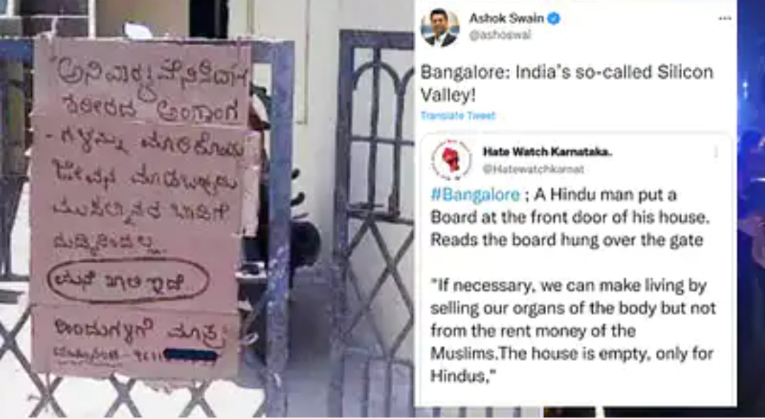 ಇಲ್ಲೇ, ಬೆಂಗಳೂರಿನ ಮನೆಯೊಂದರಲ್ಲಿ ವಿಚಿತ್ರ ಎಂಬಂತೆ ‘ಹಿಂದುಗಳಿಗೆ ಮಾತ್ರ ಈ ಮನೆ ಲಭ್ಯ, ಮುಸ್ಲಿಂರಿಗೆ ಅಲ್ಲ’ ಎಂಬ ಫಲಕವನ್ನು ಗೇಟ್ ಗೆ ಹಾಕಿದ್ದಾರೆ. ಇದೀಗ ಈ ತೂಗು ಫಲಕದ ಚಿತ್ರ ವೈರಲ್ ಆಗಿದೆ. ಈ ಫಲಕವನ್ನು ದಯಾನಂದ ಎನ್ನುವವರು ಹಾಕಿದ್ದು, ಅದಕ್ಕೆ ತಮ್ಮದೇ ಷರಾ ಬೇರೆ ಬರೆದಿದ್ದು, ಅದು ಇನ್ನಷ್ಟು ವೈರಲ್ ಆಗಿದೆ.