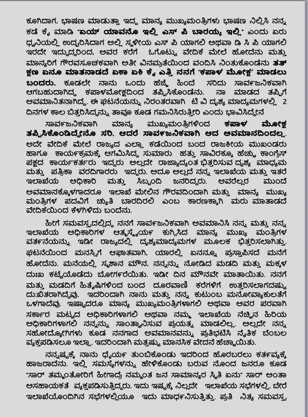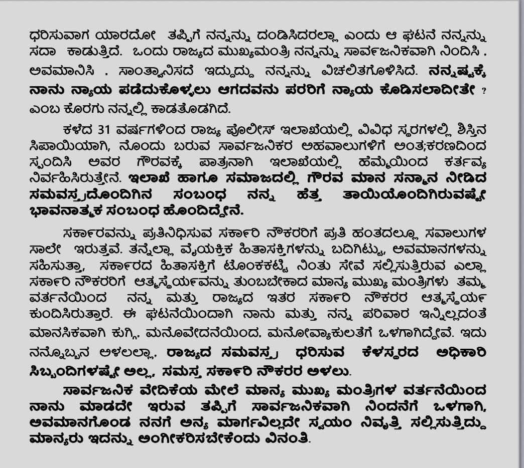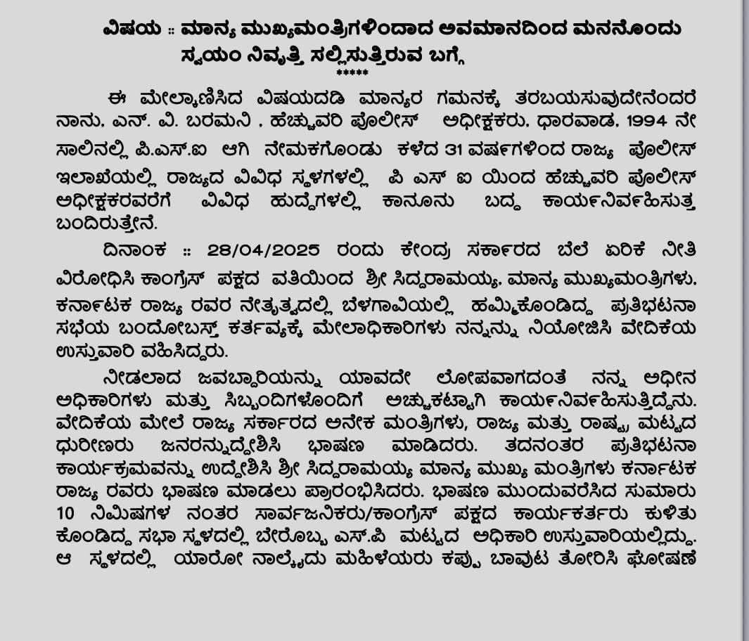 Police resign: ಸಿದ್ದರಾಮಯ್ಯ ಕೋಪಕ್ಕೆ ತುತ್ತಾಗಿದ್ದ ಬೆಳಗಾವಿ ಎಎಸ್ಪಿ ನಾರಾಯಣ ಭರಮನಿ ರಾಜೀನಾಮೆ ನೀಡಲು ನಿರ್ಧರಿಸಿದ್ದಾರೆ. ಇದೀಗ ಅವರ ರಾಜೀನಾಮೆ ಪತ್ರ ಮಾಧ್ಯಮಗಳಲ್ಲಿ ವೈರಲ್ ಆಗುತ್ತಿದೆ. ಯಾರದೋ ತಪ್ಪಿಗೆ ನನ್ನ ದಂಡಿಸಿದ್ದಾರಲಾ ಎಂದು ನೊಂದು ಭರಮನಿ ರಾಜೀನಾಮೆ ಪತ್ರ ಬರೆದಿದ್ದಾರೆ.