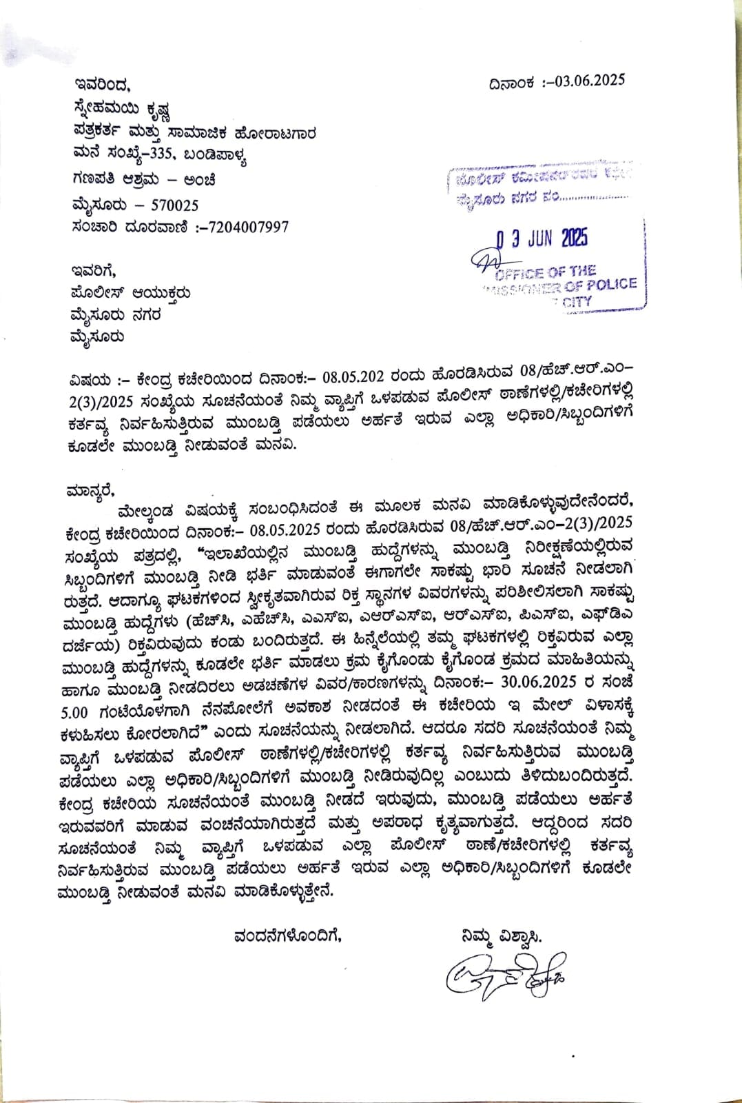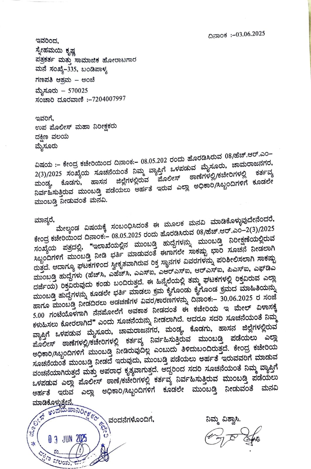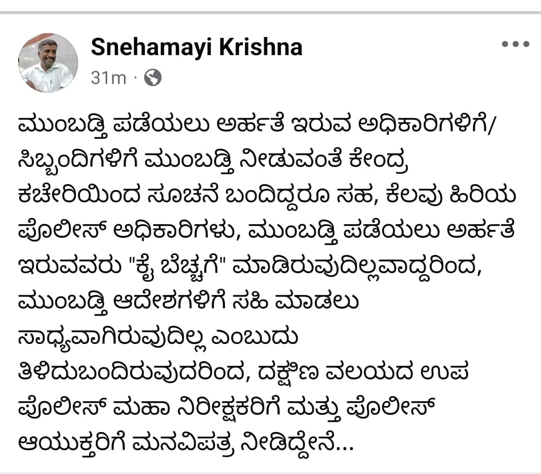 Snehamayi Krishna: ಮುಂಬಡ್ತಿ ಪಡೆಯಲು ಅರ್ಹತೆ ಇರುವ ಅಧಿಕಾರಿಗಳಿಗೆ/ಸಿಬ್ಬಂದಿಗಳಿಗೆ ಮುಂಬಡ್ತಿ ನೀಡುವಂತೆ ಕೇಂದ್ರ ಕಚೇರಿಯಿಂದ ಸೂಚನೆ ಬಂದಿದ್ದರೂ ಸಹ, ಕೆಲವು ಹಿರಿಯ ಪೊಲೀಸ್ ಅಧಿಕಾರಿಗಳು, ಮುಂಬಡ್ತಿ ಪಡೆಯಲು ಅರ್ಹತೆ ಇರುವವರು “ಕೈ ಬೆಚ್ಚಗೆ” ಮಾಡಿರುವುದಿಲ್ಲವಾದ್ದರಿಂದ, ಮುಂಬಡ್ತಿ ಆದೇಶಗಳಿಗೆ ಸಹಿ ಮಾಡಲು ಸಾಧ್ಯವಾಗಿರುವುದಿಲ್ಲ ಎಂಬುದು ತಿಳಿದುಬಂದಿರುವುದರಿಂದ, ದಕ್ಷಿಣ ವಲಯದ ಉಪ ಪೊಲೀಸ್ ಮಹಾ ನಿರೀಕ್ಷಕರಿಗೆ ಮತ್ತು ಪೊಲೀಸ್ ಆಯುಕ್ತರಿಗೆ ಮನವಿಪತ್ರ ನೀಡಿದ್ದೇನೆ ಎಂದು ಪತ್ರಕರ್ತ ಹಾಗೂ ಸಾಮಾಜಿಕ ಹೋರಾಟಗಾರ ಸ್ನೇಹಮಯಿ ಕೃಷ್ಣ ಸಾಮಾಜಿಕ ಜಾಲ ತಾಣದಲ್ಲಿ ಬರೆದುಕೊಂಡಿದ್ದಾರೆ.