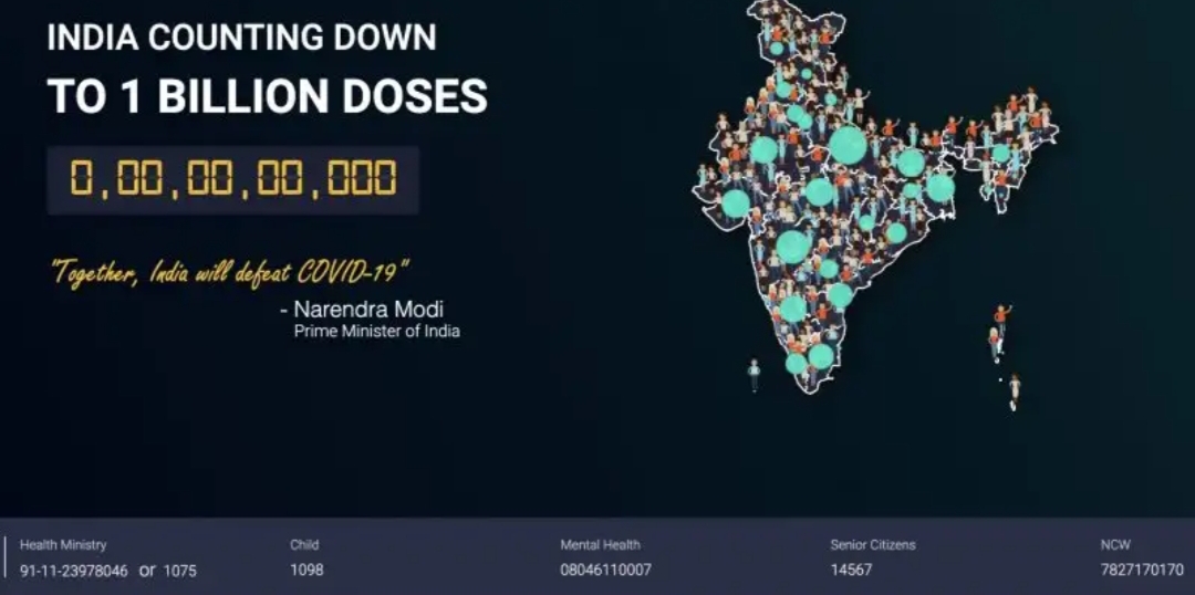 ಕೊರೋನಾ ಮಹಾಮಾರಿ ವಿರುದ್ಧದ ಹೋರಾಟದಲ್ಲಿ ಹಲವು ಸಾಧನೆಗಳನ್ನು ಮಾಡಿರುವ ಭಾರತ, ಲಸಿಕೆ ನೀಡಿಕೆಯಲ್ಲಿ ನೂರು ಕೋಟಿ ಡೋಸ್ ಪೂರ್ಣಗೊಳಿಸಿದ್ದು, ಪಿಡುಗಿನ ವಿರುದ್ಧದ ಹೋರಾಟದಲ್ಲಿ ಭಾರತ ಇಂದು ದೊಡ್ಡ ಮೈಲಿಗಲ್ಲು ಸೃಷ್ಟಿಸಿದೆ. ಇಂದಿಗೆ 100 ಕೋಟಿ (1 ಬಿಲಿಯನ್) ಲಸಿಕೆ ವಿತರಿಸಿ ಐತಿಹಾಸಿಕ ಸಾಧನೆ ಮಾಡಿದೆ.