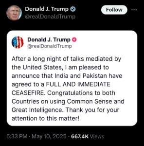 ʼನಿರಂತರ ಮಾತುಕತೆ. ಅಮೆರಿಕ ನಡೆಸಿದ ಚರ್ಚೆಗಳ ಬಳಿಕ ಭಾರತ-ಪಾಕಿಸ್ತಾನದ ಮಧ್ಯೆ ಕದನ ವಿರಾಮಕ್ಕೆ ಒಪ್ಪಿಗೆ ಬಿದ್ದಿದ್ದು, ಉಭಯ ದೇಶಗಳು ಶಾಂತಿ ಕಾಪಾಡಲು ಮುಂದಾಗಿರುವುದಕ್ಕೆ ನಾನು ಅಭಿನಂದನೆ ಸಲ್ಲಿಸುತ್ತೇನೆʼ ಎಂದು ಟ್ರಂಪ್ ಟ್ವೀಟ್ ಮಾಡಿದ್ದಾರೆ.