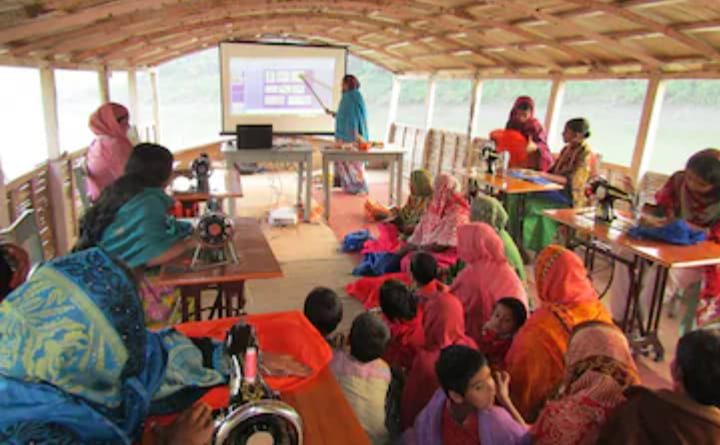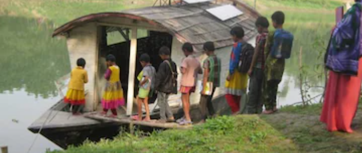 ಬಾಂಗ್ಲಾದೇಶದ ಅಟ್ರೈ ನದಿ ದಡದಲ್ಲಿರುವ ಹುಲ್ಲಿನಲ್ಲಿ ಸಣ್ಣ ಗುಡಿಸಲಿನ ರೀತಿ ಕಾಣುವ ಹಲವು ಶಾಲೆಗಳನ್ನು ದೋಣಿಯ ಮೇಲೆ ನಿರ್ಮಾಣ ಮಾಡಲಾಗಿದೆ. ಇದರೊಳಗೆ ಮಕ್ಕಳಿಗೆ ಪಾಠ ಮಾಡಲಾಗುತ್ತದೆ. ಈ ದೋಣಿಯ ಒಳಭಾಗದಲ್ಲಿ ಕಿರಿದಾದ ಬೆಂಚುಗಳಿದ್ದು, ಒಟ್ಟು 29 ವಿದ್ಯಾರ್ಥಿಗಳು ಮಾತ್ರ ಒಂದು ದೋಣಿಯಲ್ಲಿ ಕೂರಲು ಸಾಧ್ಯವಾಗುತ್ತದೆ.
