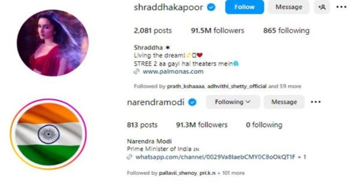 ಸ್ತ್ರೀ 2’ ಸಿನಿಮಾದ ಯಶಸ್ಸಿನ ಬಳಿಕ ಶ್ರದ್ಧಾಗೆ ಇನ್ಸ್ಟಾಗ್ರಾಂನಲ್ಲಿ 91.5 ಮಿಲಿಯನ್ (9.15 ಕೋಟಿ) ಜನರು ಫಾಲೋ ಮಾಡ್ತಿದ್ದಾರೆ. ಅದೇ ಪ್ರಧಾನಿ ಮೋದಿ ಅವರಿಗೆ 91.3 (9.13 ಕೋಟಿ) ಜನರು ಹಿಂಬಾಲಕರಿದ್ದಾರೆ. ನರೇಂದ್ರ ಮೋದಿ ಅವರನ್ನು ಹಿಂದಿಕ್ಕಿ ಸದ್ಯ ನಟಿ ಶ್ರದ್ಧಾ 3ನೇ ಸ್ಥಾನದಲ್ಲಿದ್ದಾರೆ. ಇನ್ನು 2ನೇ ಸ್ಥಾನದಲ್ಲಿ ಬಾಲಿವುಡ್‌ನ ರಸಿಕರ ರಾಣಿ ಪ್ರಿಯಾಂಕಾ ಚೋಪ್ರಾ ಮತ್ತು ಮೊದಲ ಸ್ಥಾನದಲ್ಲಿ ಕ್ರಿಕೆಟಿಗ ವಿರಾಟ್ ಕೊಹ್ಲಿ, ಬರೋಬ್ಬರಿ 270 ಮಿಲಿಯನ್ ಫಾಲೋವರ್ಸ್ ಹೊಂದಿದ್ದಾರೆ.