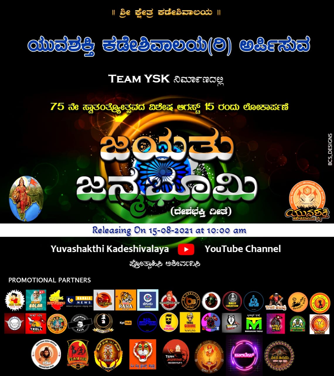 ಸದಾ ಸಾಮಾಜಿಕ ಧಾರ್ಮಿಕ ಚಟುವಟಿಕೆಗಳಲ್ಲಿ ಗುರುತಿಸಿಕೊಂಡಿರುವ ಯುವಶಕ್ತಿ(ರಿ)ಕಡೇಶಿವಾಲಯ ನಿರ್ಮಾಣ ಮಾಡಿರುವ ಬಹುನಿರೀಕ್ಷಿತ ದೇಶಭಕ್ತಿ ಗೀತೆ, ಜಯತು ಜನ್ಮಭೂಮಿ 75 ನೇ ಸ್ವಾತಂತ್ರ್ಯ ದಿನವಾದ ಇಂದು ಯುವಶಕ್ತಿ ಯು ಟ್ಯೂಬ್ ಚಾನೆಲ್ ನಲ್ಲಿ ಬಿಡುಗಡೆಗೊಂಡಿತು.