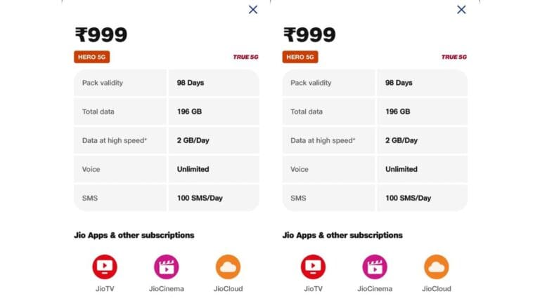 ಕೇವಲ 999 ರೂ ಪಾವತಿಸಿ 98 ದಿನಗಳ ವ್ಯಾಲಿಡಿಟಿ ಇರುವ ಈ ಪ್ಲಾನ್ ನಲ್ಲಿ ಗ್ರಾಹಕರು ಉಚಿತವಾಗಿ ಅನಿಯಮಿತ ಧ್ವನಿ ಕರೆಗಳ ಪ್ರಯೋಜನವನ್ನು ಪಡೆಯಲು ಸಾಧ್ಯವಿದೆ. ಇದರ ಜೊತೆಗೆ ಪ್ರತಿದಿನ 2GB ಡೇಟಾದ ಬಳಕೆಯನ್ನು ಪಡೆಯಲು ಸಾಧ್ಯವಿದೆ. ಹಾಗೂ ಪ್ರತಿದಿನ 100 SMS ಉಚಿತವಾಗಿದೆ. ಒಟ್ಟಾರೆಯಾಗಿ ಈ ಪ್ಲಾನ್ ನಲ್ಲಿ 196GB ಡೇಟಾ ಬಳಸಲು ಸಾಧ್ಯ ಆಗುತ್ತದೆ.