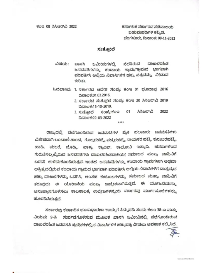 ಈ ಕುರಿತಂತೆ ಕಂದಾಯ ಇಲಾಖೆಯ ( Revenue Department ) ಸರ್ಕಾರದ ಉಪ ಕಾರ್ಯದರ್ಶಿ ಸುತ್ತೋಲೆ ಹೊರಡಿಸಿದ್ದು, ರಾಜ್ಯದಲ್ಲಿ ನೆಲೆಗೊಂಡಿರುವಂತ ಜನವಸತಿಗಳ ಪೈಕಿ ಹಲವಾರು ಜನವಸತಿಗಳು ವಿಶೇಷವಾಗಿ ಲಂಬಾಣಿ ತಾಂಡ, ಗೊಲ್ಲರಹಟ್ಟಿ, ವಡ್ಡರಹಟ್ಟಿ, ನಾಯಕರ ಹಟ್ಟಿ, ಕುರುಬರ ಹಟ್ಟಿ, ಹಾಡಿ, ಮಜರೆ, ದೊಡ್ಡಿ, ಪಾಳ್ಯ, ಕ್ಯಾಂಪ್, ಕಾಲೋನಿ ಇತ್ಯಾದಿ ಹೆಸರುಗಳಿಂದ ಗುರುತಿಸಲ್ಪಟ್ಟಿರುವ ಜನವಸತಿಗಳು ದಾಖಲೆರಹಿತವಾಗಿಯೇ ಸಮಾಜದ ಮುಖ್ಯ ವಾಹಿನಿಗೆ ಬರದೇ ಉಳಿದುಕೊಂಡಿರುತ್ತಾರೆ ಎಂದಿದ್ದಾರೆ.