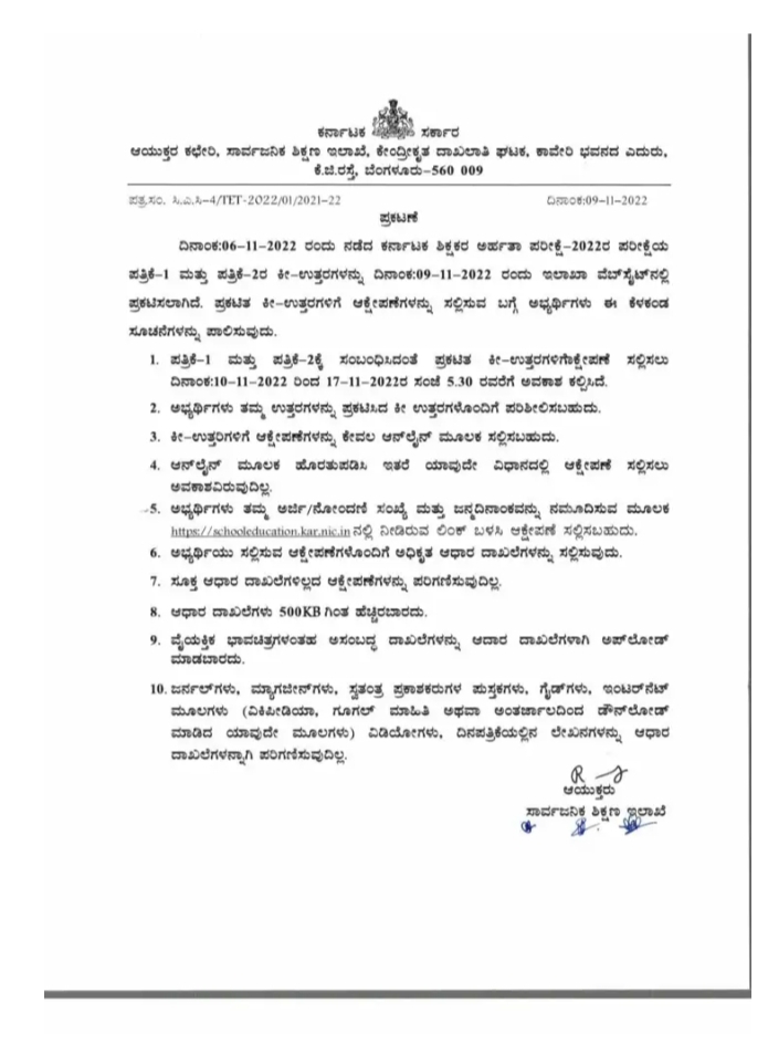 ಟಿಇಟಿ ಪರೀಕ್ಷೆಯ ಸರಿ ಉತ್ತರಗಳನ್ನು ಇಲಾಖೆಯ ವೆಬ್ಸೈಟ್ www.schooleducation.kar.nic.in ಜಾಲತಾಣದಲ್ಲಿ ವೀಕ್ಷಿಸಬಹುದಾಗಿದೆ. ಈ ಸಂಬಂಧದ ಆಕ್ಷೇಪಣೆಗಳನ್ನು ಅಭ್ಯರ್ಥಿಗಳು ದಿನಾಂಕ 10-11 2022 ರಿಂದ 17-11-2022ರ ಒಳಗಾಗಿ ಸಲ್ಲಿಸುವಂತೆ ತಿಳಿಸಿದೆ.