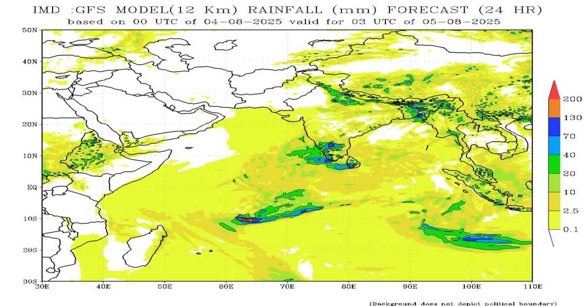 ಕೆರಳ ಹಾಗೂ ತಮಿಳುನಾಡು ದಕ್ಷಿಣ ಭಾಗದಲ್ಲಿ ಸಣ್ಣ ಮೇಲ್ಮೈ ಸುಳಿಗಾಳಿ ಉಂಟಾಗಿದ್ದರಿಂದ ಕೇರಳದಲ್ಲಿ ಭಾರಿ ಮಳೆಯ ಮುನ್ಸೂಚೆನೆ ಇದೆ. ಈಗಿನ ಲೆಕ್ಕಾಚಾರದ ಪ್ರಕಾರ ತಿರುಗುವಿಕೆಯು ಕೇರಳ ಕರಾವಳಿ ಮೂಲಕ ಉತ್ತರಕ್ಕೆ ಚಲಿಸುವ ಸಾಧ್ಯತೆಗಳಿದ್ದುದರಿಂದ ಆಗಸ್ಟ್ 6 ಹಾಗೂ 7ರಂದು ಕಾಸರಗೋಡು, ದಕ್ಷಿಣ ಕನ್ನಡ ಹಾಗೂ ಉಡುಪಿ ಜಿಲ್ಲೆಗಳಲ್ಲಿ ಹೆಚ್ಚು ಮಳೆಯ ಮುನ್ಸೂಚನೆ ಇದೆ.