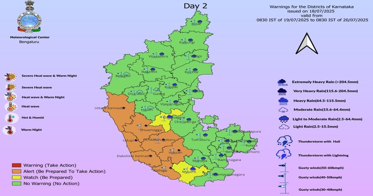 ಒಳನಾಡು : ಉತ್ತರ ಒಳನಾಡಿನ ಬೆಳಗಾವಿಯ ಒಂದೆರಡು ಕಡೆ, ಧಾರವಾಡ, ಹಾವೇರಿ, ಗದಗ, ಬಾಗಲಕೋಟೆಯ ಒಂದೆರಡು ಕಡೆ, ದಾವಣಗೆರೆ, ಬಳ್ಳಾರಿ, ರಾಯಚೂರು, ಯಾದಗಿರಿ, ಕಲಬುರ್ಗಿ, ಬೀದರ್ ಜಿಲ್ಲೆಗಳ ಅಲ್ಲಲ್ಲಿ ಸಾಮಾನ್ಯ ಮಳೆಯ ಮುನ್ಸೂಚನೆ ಇದೆ. ದಕ್ಷಿಣ ಒಳನಾಡಿನ ಬಹುತೇಕ ಭಾಗಗಳಲ್ಲಿ ಉತ್ತಮ ಮಳೆಯ ಮುನ್ಸೂಚೆನೆ ಇದೆ. ಈಗಿನಂತೆ ಜುಲೈ 26ರ ತನಕವೂ ರಾಜ್ಯದ ಉತ್ತರ ಹಾಗೂ ದಕ್ಷಿಣ ಒಳನಾಡಿನ ಬಹುತೇಕ ಭಾಗಗಳಲ್ಲಿ ಮಳೆಯ ಮುನ್ಸೂಚನೆ ಇದೆ.
