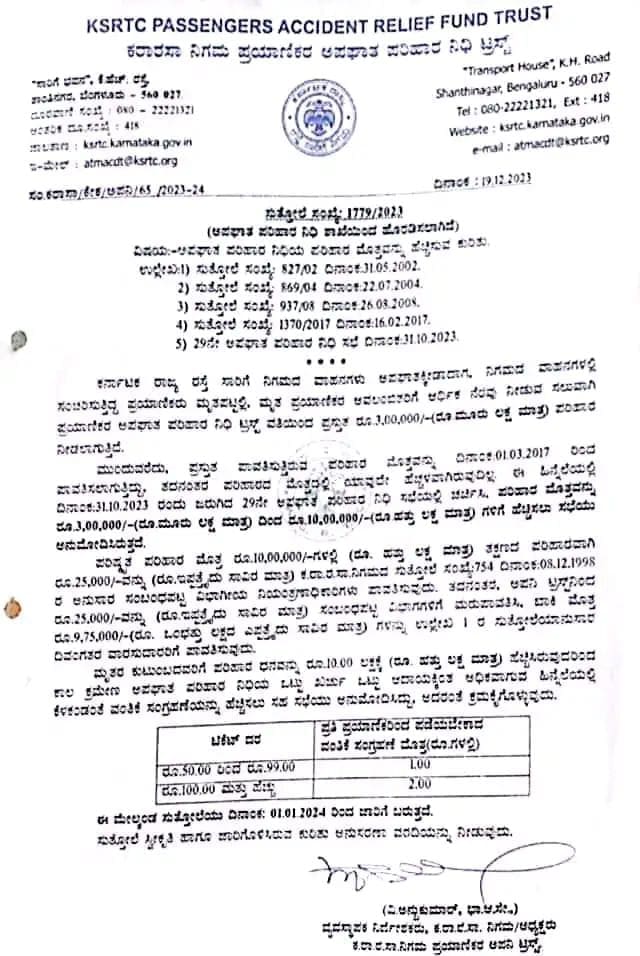 KSRTC: ಕರ್ನಾಟಕ ರಾಜ್ಯ ರಸ್ತೆ ಸಾರಿಗೆ ನಿಗಮದ ವಾಹನಗಳು ಅಪಘಾತಕ್ಕೀಡಾದ (Accident)ಸಂದರ್ಭ ನಿಗಮದ ವಾಹನಗಳಲ್ಲಿ ಸಂಚರಿಸುತ್ತಿದ್ದ ಪ್ರಯಾಣಿಕರು ನಿಧನರಾದರೆ (Death)ಮೃತಪಟ್ಟ ಪ್ರಯಾಣಿಕರ ಅವಲಂಬಿತರಿಗೆ ನೆರವಾಗುವ ನಿಟ್ಟಿನಲ್ಲಿ ಆರ್ಥಿಕ ನೆರವು ನೀಡಲಾಗುತ್ತದೆ. ಹೀಗಾಗಿ, ಪ್ರಯಾಣಿಕರ ಅಪಘಾತ ಪರಿಹಾರ ನಿಧಿ ಟ್ರಸ್ಟ್ ವತಿಯಿಂದ ಪ್ರಸ್ತುತ ರೂ.1,00,000/-(ರೂ ಮೂರು ಲಕ್ಷ ಮಾತ್ರ) ಪರಿಹಾರ ಒದಗಿಸಲಾಗುತ್ತಿದೆ.