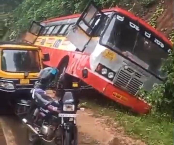 Accident: ಮಡಿಕೇರಿ – ಮಂಗಳೂರು ರಾಷ್ಟ್ರೀಯ ಹೆದ್ದಾರಿ ನಡುವಿನ ಕಲ್ಲುಗುಂಡಿ ಸಮೀಪದ ಕಡೆಪಾಲ ಎಂಬಲ್ಲಿ KSRTC ಬಸ್ ನಿಯಂತ್ರಣ ಕಳೆದುಕೊಂಡು ಬರೆಗೆ ಗುದ್ದಿ ವಾಲಿಕೊಂಡು ನಿಂತಿದೆ. ಇಂದು ಬೆಳಿಗ್ಗೆ ಈ ಅಪಘಾತ (Accident) ಸಂಭವಿಸಿದ್ದು, ಅದೃಷ್ಟವಶಾತ್ ಬಸ್ಸಿನಲ್ಲಿದ್ದವರು ಪ್ರಾಣಾಪಾಯದಿಂದ ಪಾರಾಗಿದ್ದಾರೆ