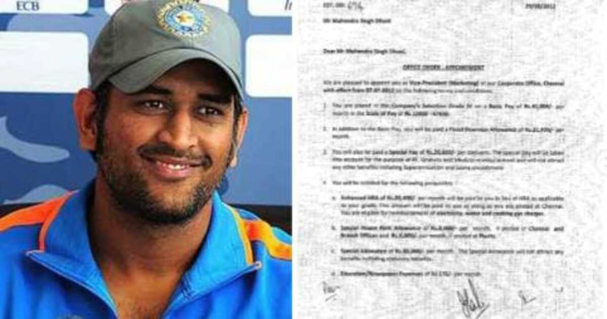 ಹೌದು, 2012ರಲ್ಲಿ ಸಿಮೆಂಟ್ ಕಂಪನಿಯೊಂದರಿಂದ ಇಂಡಿಯಾ ಸಿಮೆಂಟ್ಸ್ನ ಉಪಾಧ್ಯಕ್ಷ(vice-president) ಹುದ್ದೆಗೆ ಸಿಎಸ್ಕೆ ನಾಯಕನಿಗೆ ಆಫರ್ ಲೆಟರ್ ನೀಡಲಾಗಿತ್ತು. ಇದೀಗ ಈ ಹಳೆಯ ಆಫರ್ ಲೆಟರ್ ವೈರಲ್ ಆಗಿದೆ. ಧೋನಿಗೆ ಈ ಕೆಲಸಕ್ಕಾಗಿ ಆಫರ್ ಲೆಟರ್ನಲ್ಲಿ ನಮೂದಿಸಿದ ಸಂಭಾವನೆಯನ್ನು ನೋಡಿದ ಅಭಿಮಾನಿಗಳಿಗೆ ಅಚ್ಚರಿಯನ್ನು ಮೂಡಿಸಿದೆ.