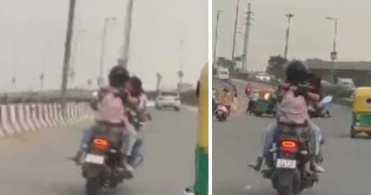 ದೆಹಲಿಯ(Delhi) ಮಂಗೋಲ್ಪುರಿ (Mangolpuri) ಹೊರವರ್ತುಲ ರಸ್ತೆಯಲ್ಲಿ ಈ ವಿಡಿಯೋ ಸೆರೆಹಿಡಿಯಲಾಗಿದೆ. ವೈರಲ್ ಆಗುತ್ತಿರುವ ವಿಡಿಯೋದಲ್ಲಿ, ಬೈಕ್ ಓಡಿಸುತ್ತಿರುವವನು ಹೆಲ್ಮೆಟ್​ (Helmet) ಹಾಕಿಕೊಂಡಿದ್ಧಾನೆ ಆದರೆ ಆಕೆ ಹಾಕಿಕೊಂಡಿಲ್ಲ. ಹುಡುಗಿಯು ಬೈಕ್ ನ ಮುಂಭಾಗದಲ್ಲಿ ಕುಳಿತು ತಿರುಗಿ ಹುಡುಗನನ್ನು ಬಿಗಿದಪ್ಪಿಕೊಂಡಿದ್ದಾಳೆ ಹುಡುಗನು ಬೈಕ್ ಓಡಿಸುತ್ತಿದ್ದಾನೆ. ಈ ವಿಡಿಯೋ ವೈರಲ್ ಆಗುತ್ತಿದ್ದಂತೆ ದೆಹಲಿ ಸಂಚಾರಿ ಪೊಲೀಸರು (Delhi traffic police) ಎಚ್ಚೆತ್ತುಕೊಂಡಿದ್ದಾರೆ. ಗಾಝಿಯಾಬಾದ್​ನ ಪೊಲೀಸರು ಈ ವಿಡಿಯೋಗೆ ಪ್ರತಿಕ್ರಿಯಿಸಿದ್ದಾರೆ.